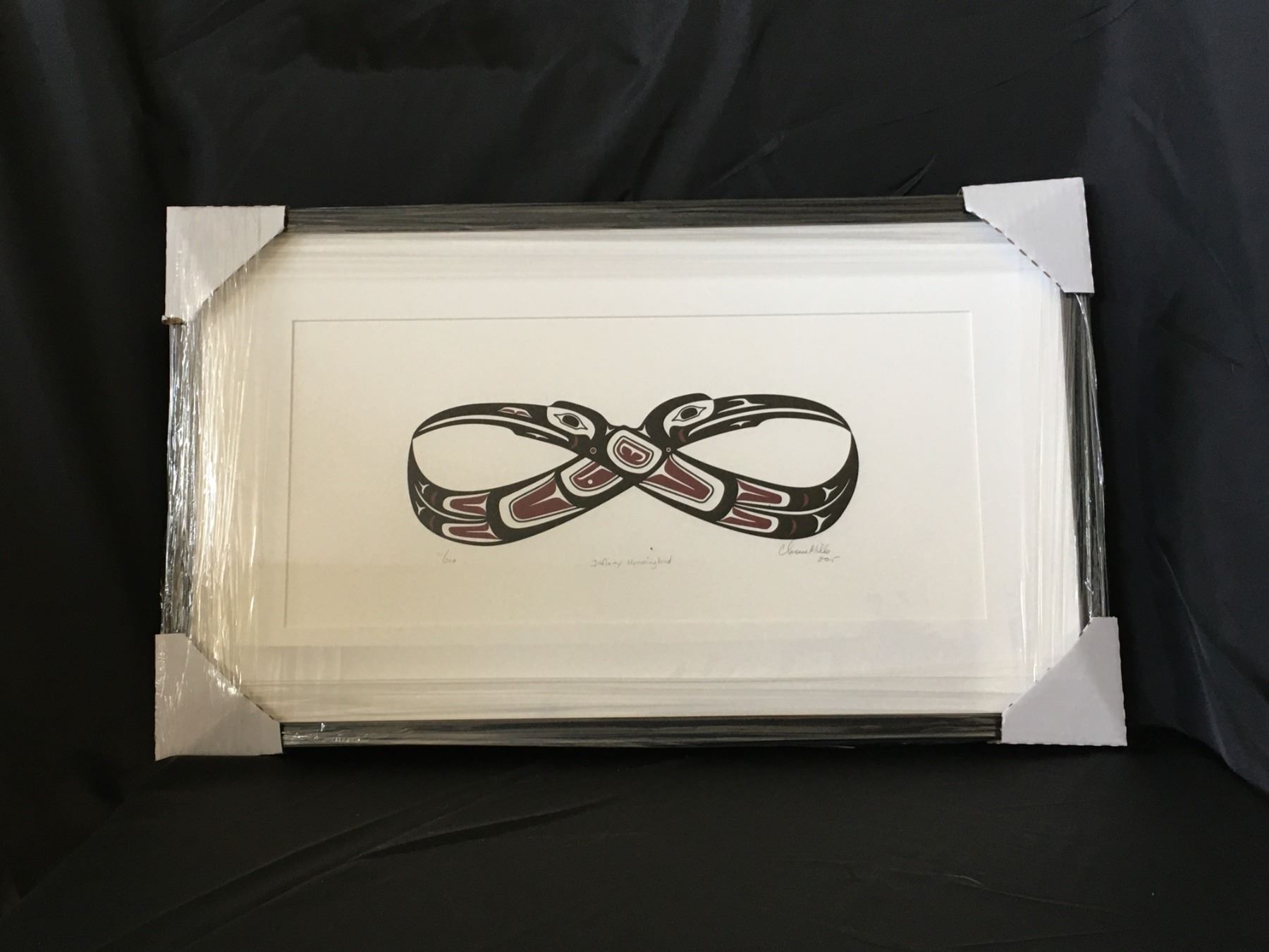 Seeing Double - Clarence Mills Limited Edition "Infinity Hummingbird" Prints Donated by: Clarence Mills. Value: $550 Gah-ghin-skuss meaning "out of your own land" is the Haida name of Clarence Mills born at Skidegate, Haida Gwaii (a member of the Eagle Clan of Skidegate British Columbia). Clarence is the grandson of Jimmy WIlson a hereditary Chief Skedans and his crest is the Split Eagle and Grizzly Bear. Clarence Mills is known globally for his artwork, carvings, jewelry and monumental size totem poles which have taken center stage at many international event including on display at the President's Palace in Paris, France. Infinity HummingBird is a first of its kind design incorporating the traditional Haida humming bird- the messenger in an infinity loop representing eternal love.