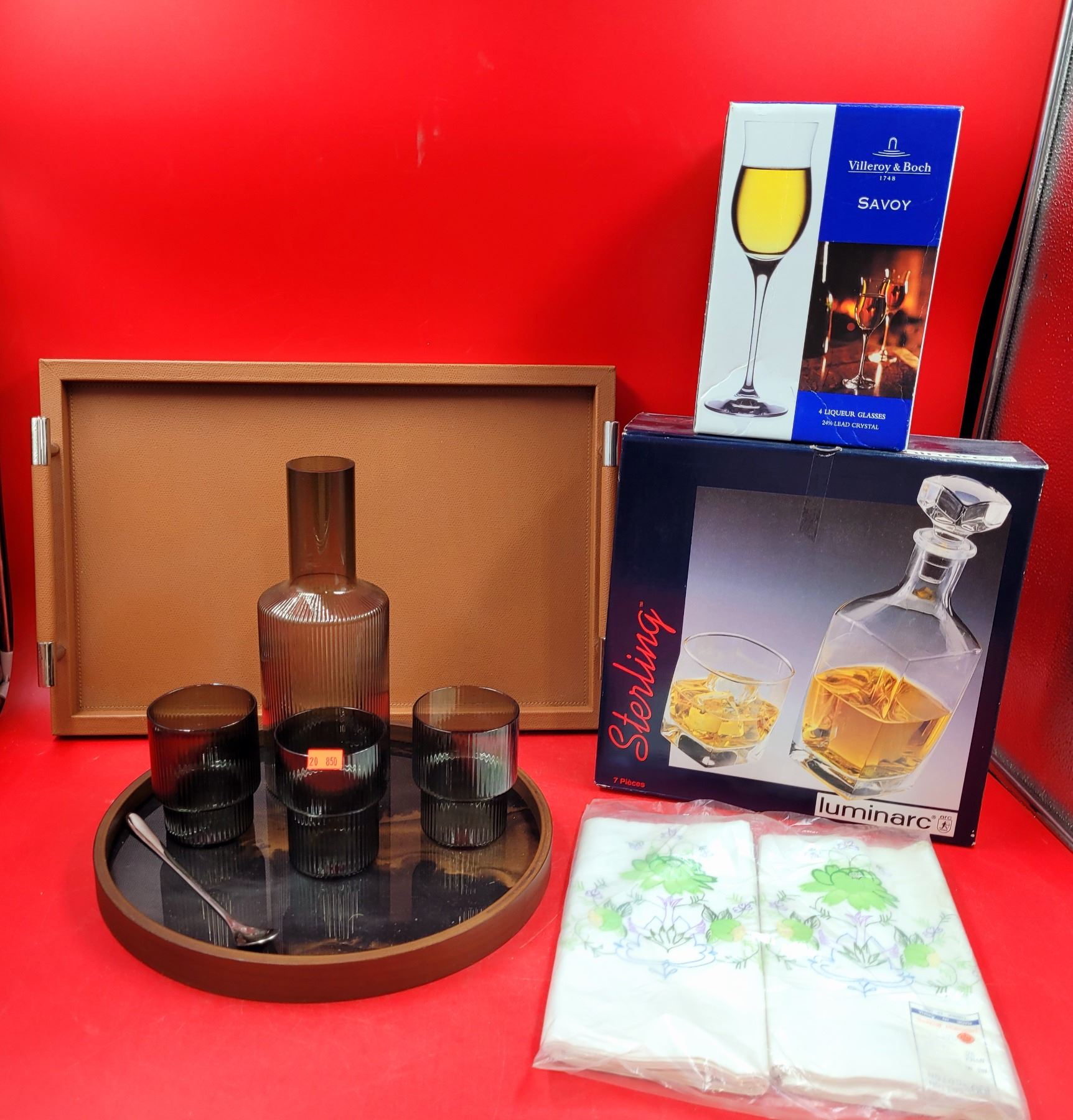 Serve Ware Lot w/ Serving Tray, 2 Decanter Sets, & 4 Liqueur Glasses