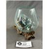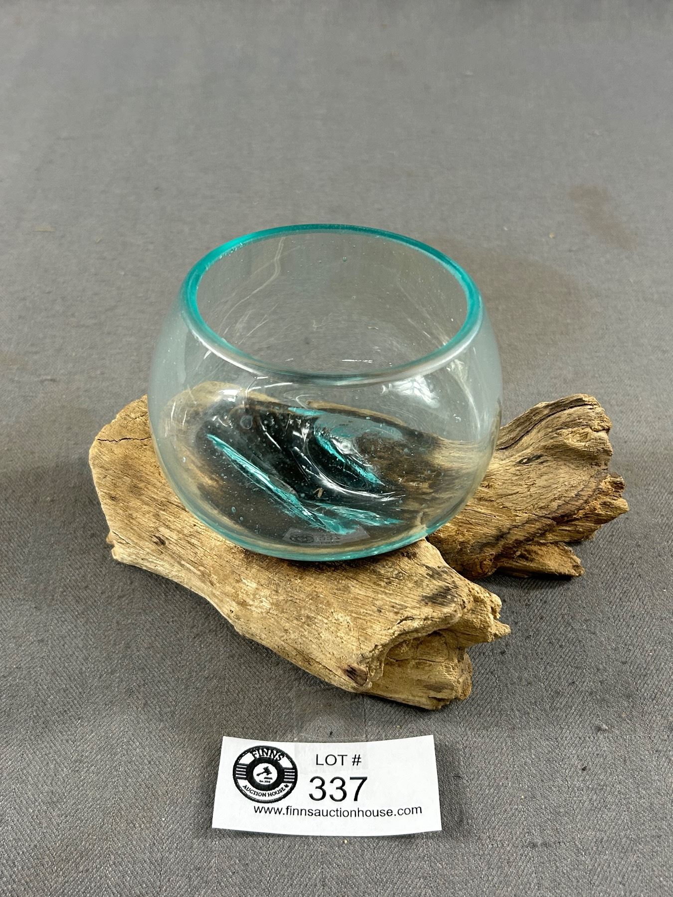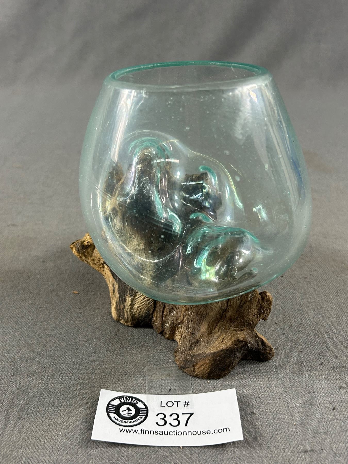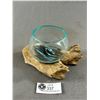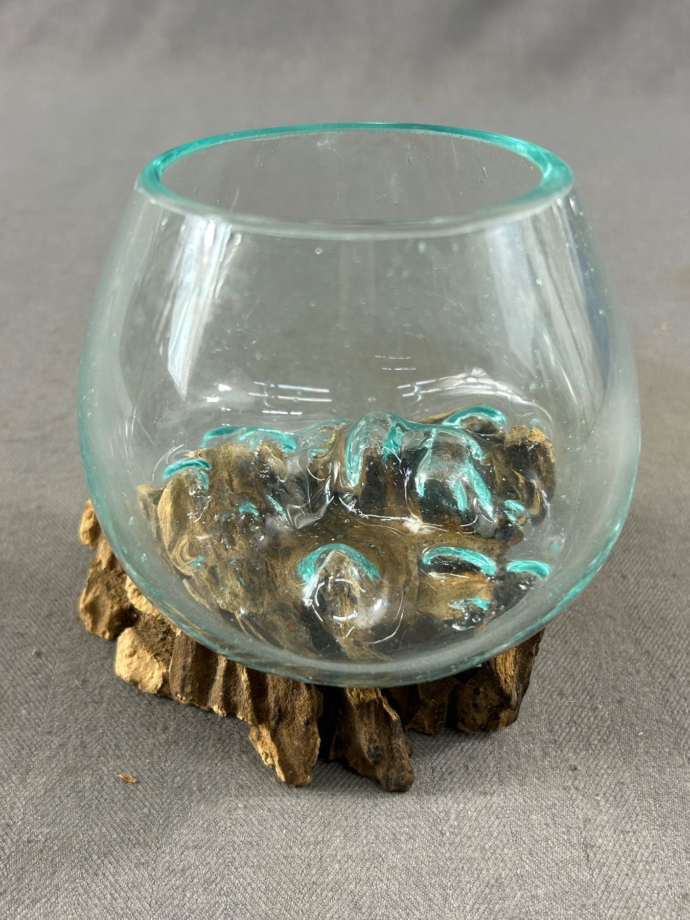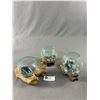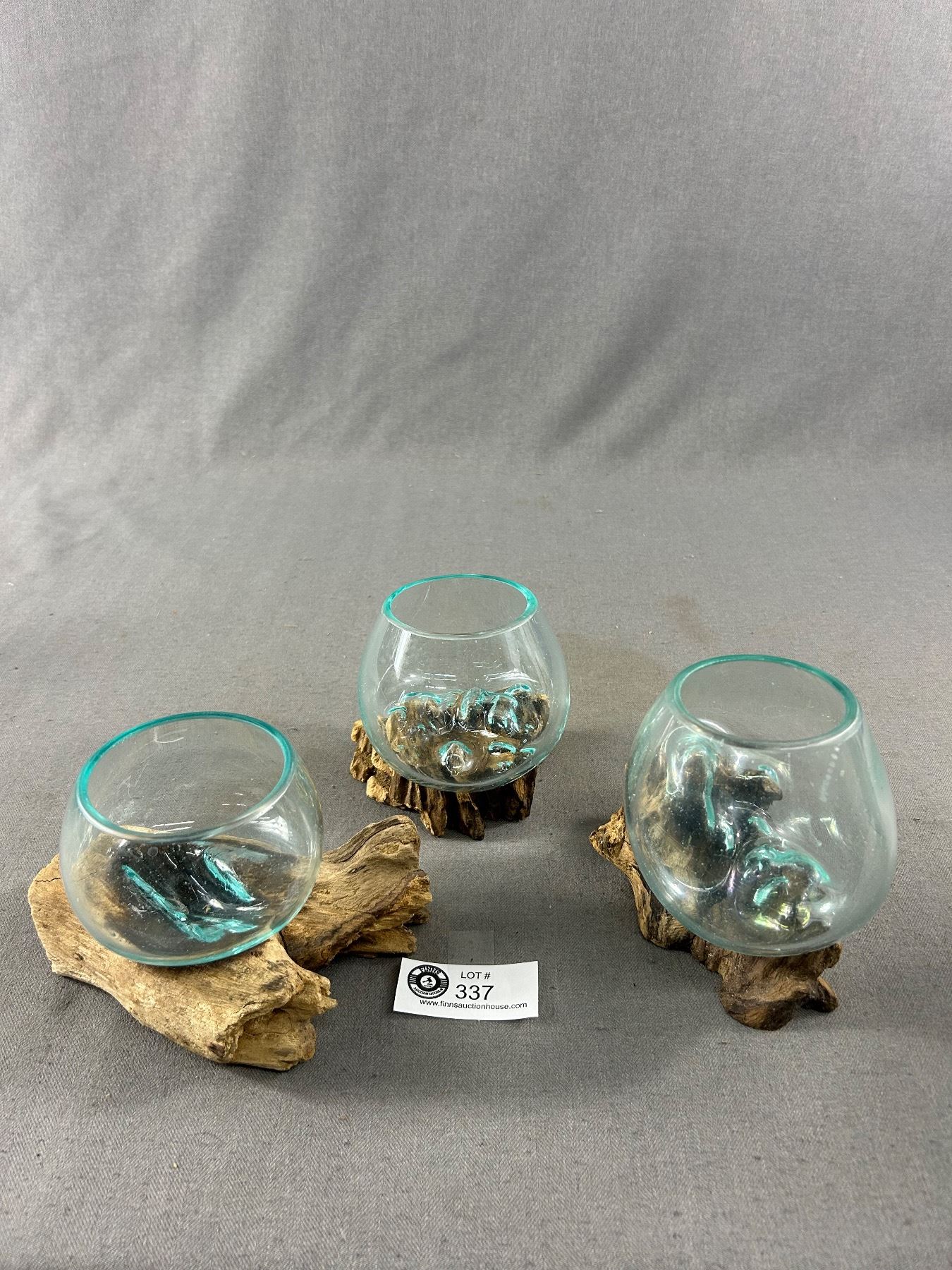 Set Of 3 Glass Candle Holders w/ Teak Wood Bases