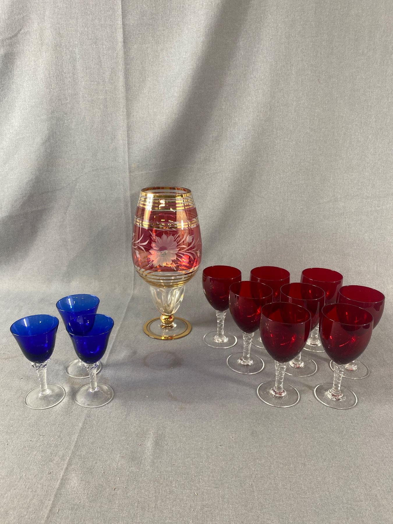 Set Of Red & Blue Appertif Glasses w/Twisted Stems & Etched Cranberry & Gold Pedestal Glass Approx.
