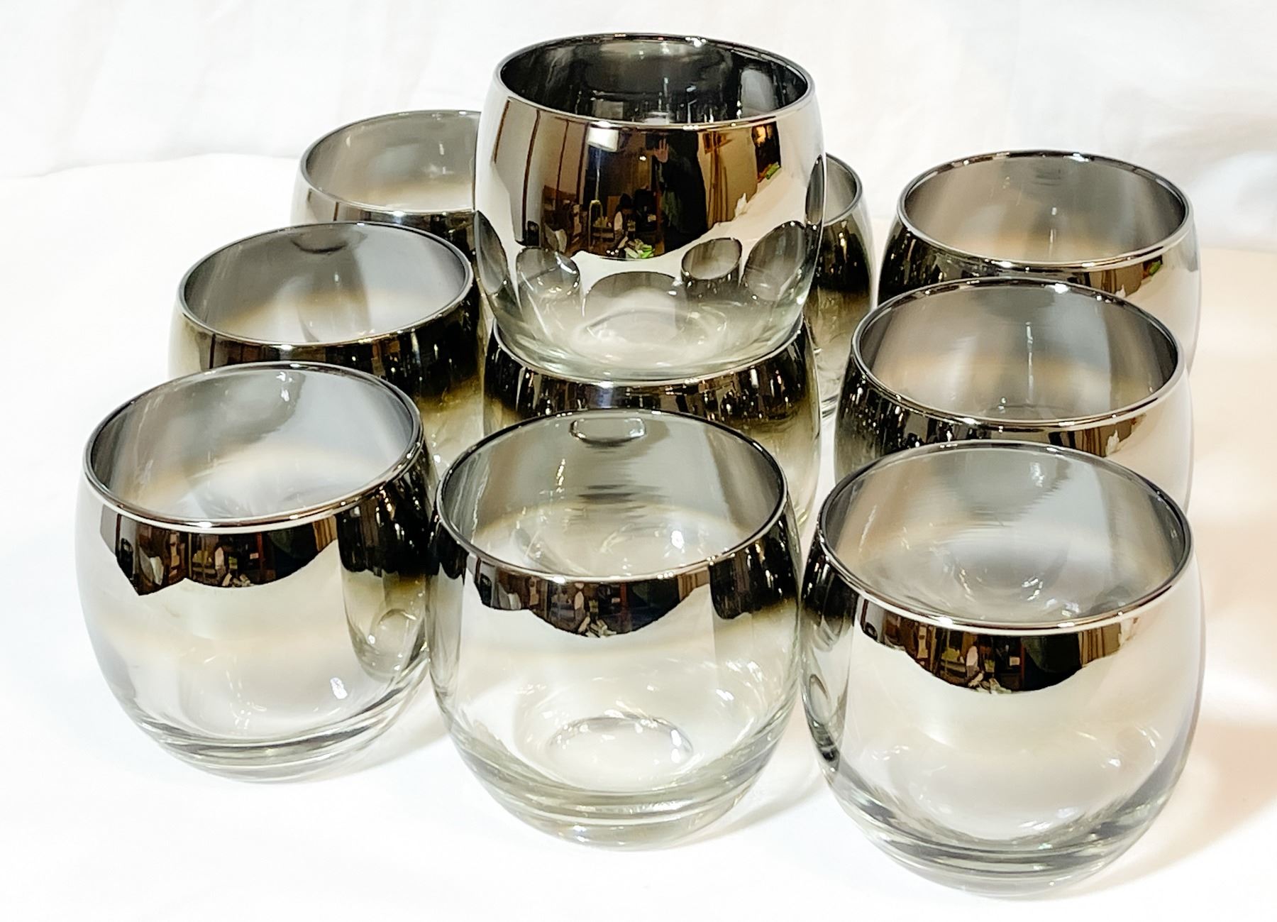 Stylish set of ten vintage lowball glasses with a sleek silver ombre fade finish. Classic mid-century modern design reminiscent of the Mad Men cocktail era, perfect for entertaining or display in a retro bar. All in good vintage condition with bright reflective sheen and no chips or cracks. A timeless addition to any vintage glassware or barware collection.