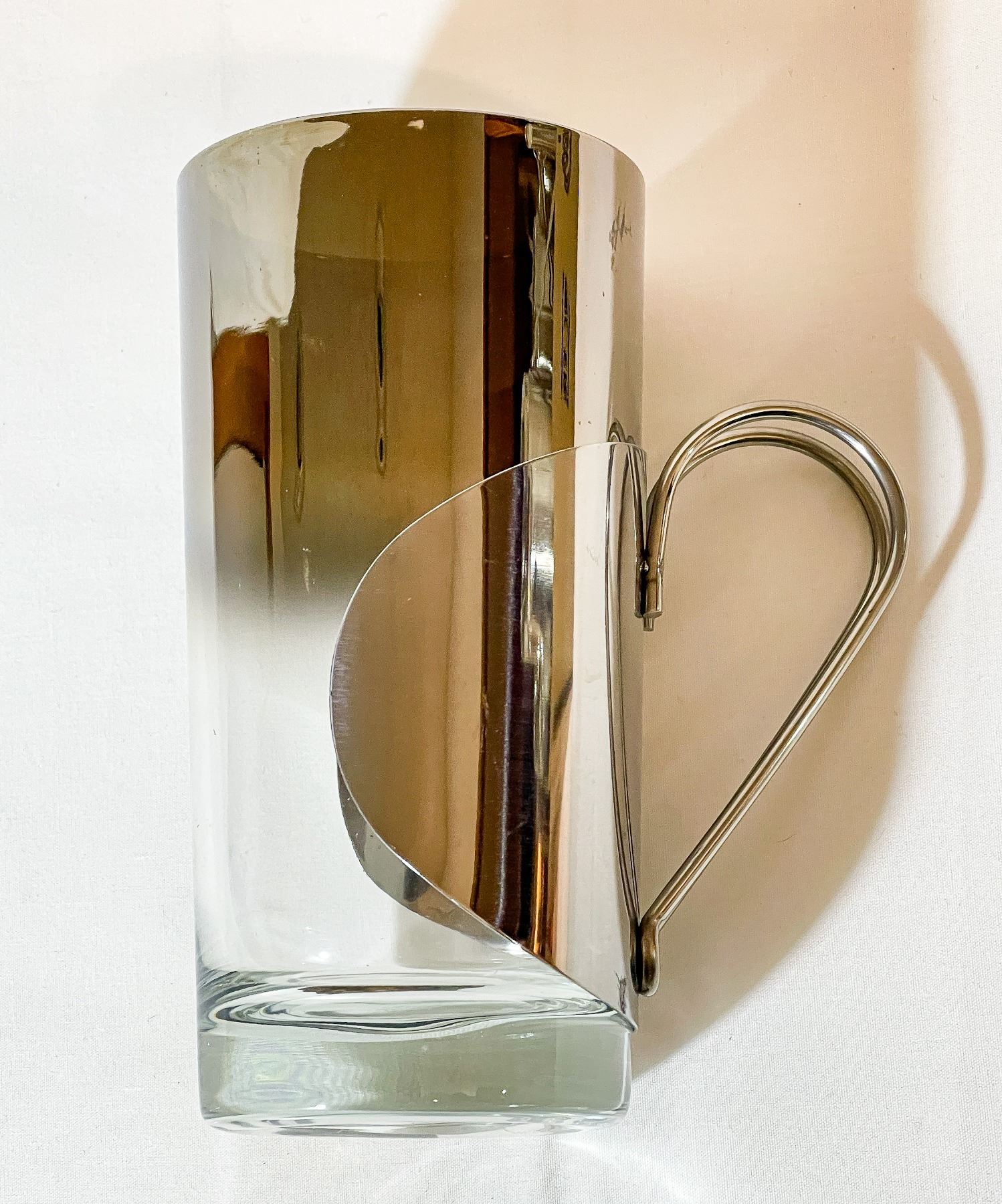Elegant set of eleven vintage tall silver-fade ombre glasses featuring sleek curved metal handles in the Scanmalay style—perfect for hot toddies, Irish cream, or other warm beverages. These mid-century modern glasses combine sophisticated design with practical form, offering a unique reflective finish and sculptural handle detail. Excellent retro barware addition.