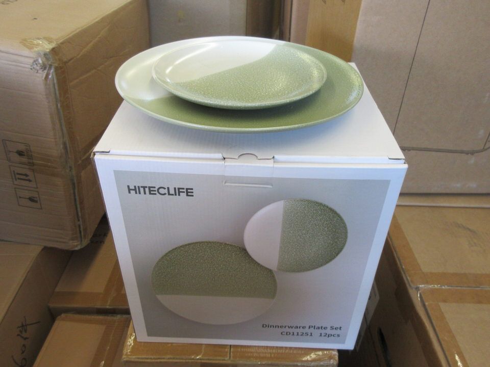 Six 8" salad plates and six 10.8" dinner plates. Dishwasher and microwave safe. Hiteclife product.