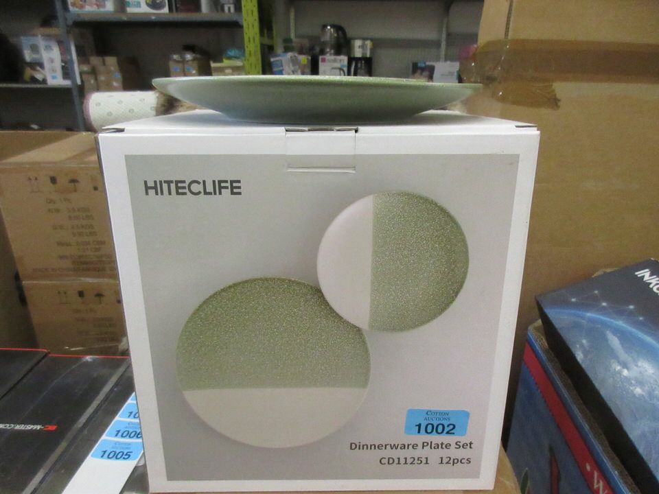 Green & Grey. Six 8" salad plates and six 10.8" dinner plates. Ceramic. Dishwasher and microwave safe.