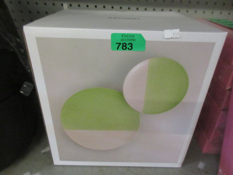 Bright Green/White. Six 8" salad plates and six 10.8" dinner plates. Dishwasher and microwave safe.