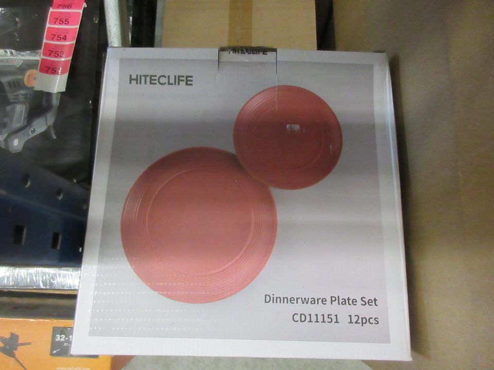 Russet Red. Six 8" salad plates and six 10.8" dinner plates. Dishwasher and microwave safe.