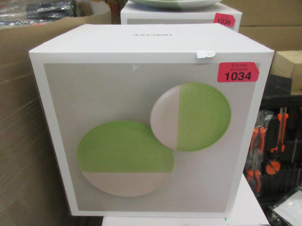 Bright Green/White. Six 8" salad plates and six 10.8" dinner plates. Dishwasher and microwave safe.