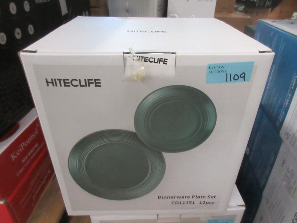 Dark Green. Six 8" salad plates and six 10.8" dinner plates. Dishwasher and microwave safe.