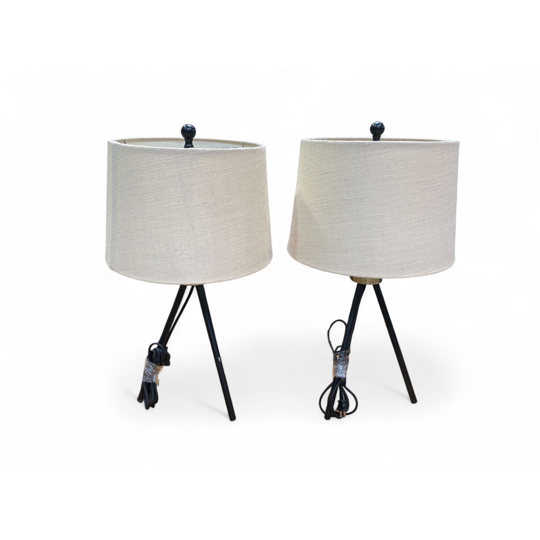 Set of 2 Modern Industrial Tripod Table Lamps w/ Beige Fabric Lampshades - Untested