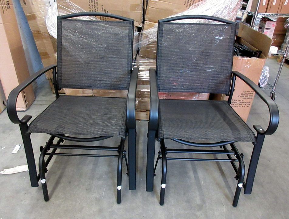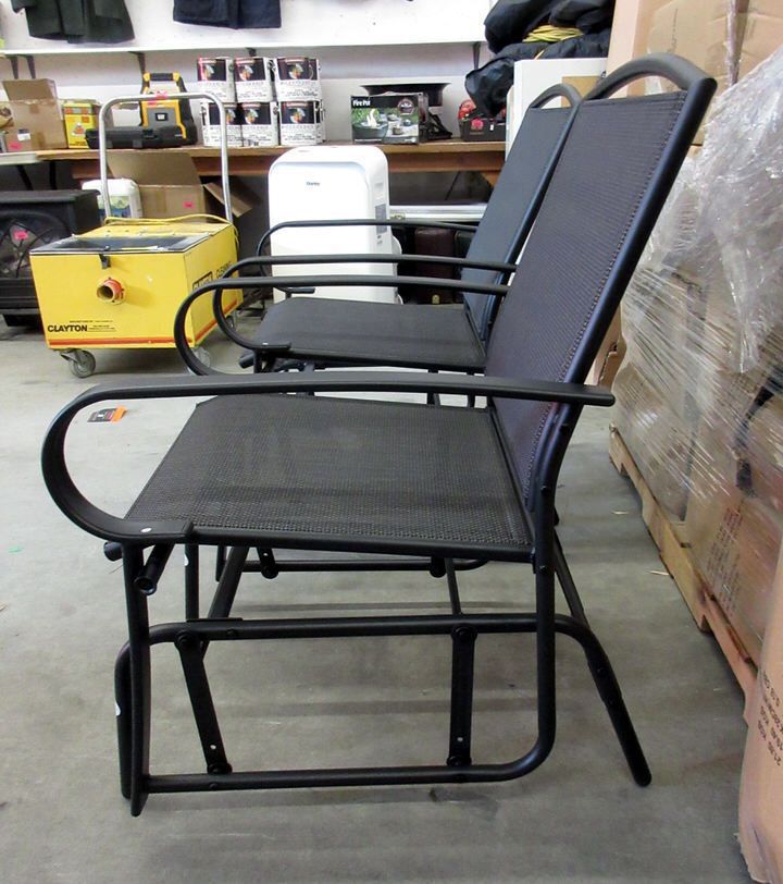 Textilene weather resistant fabric on a powder coated steel frame. Quick, easy assembly. Holds a max weight of 300 lbs. Integrated rocker arms. Amazon Basics product. #2022310.
