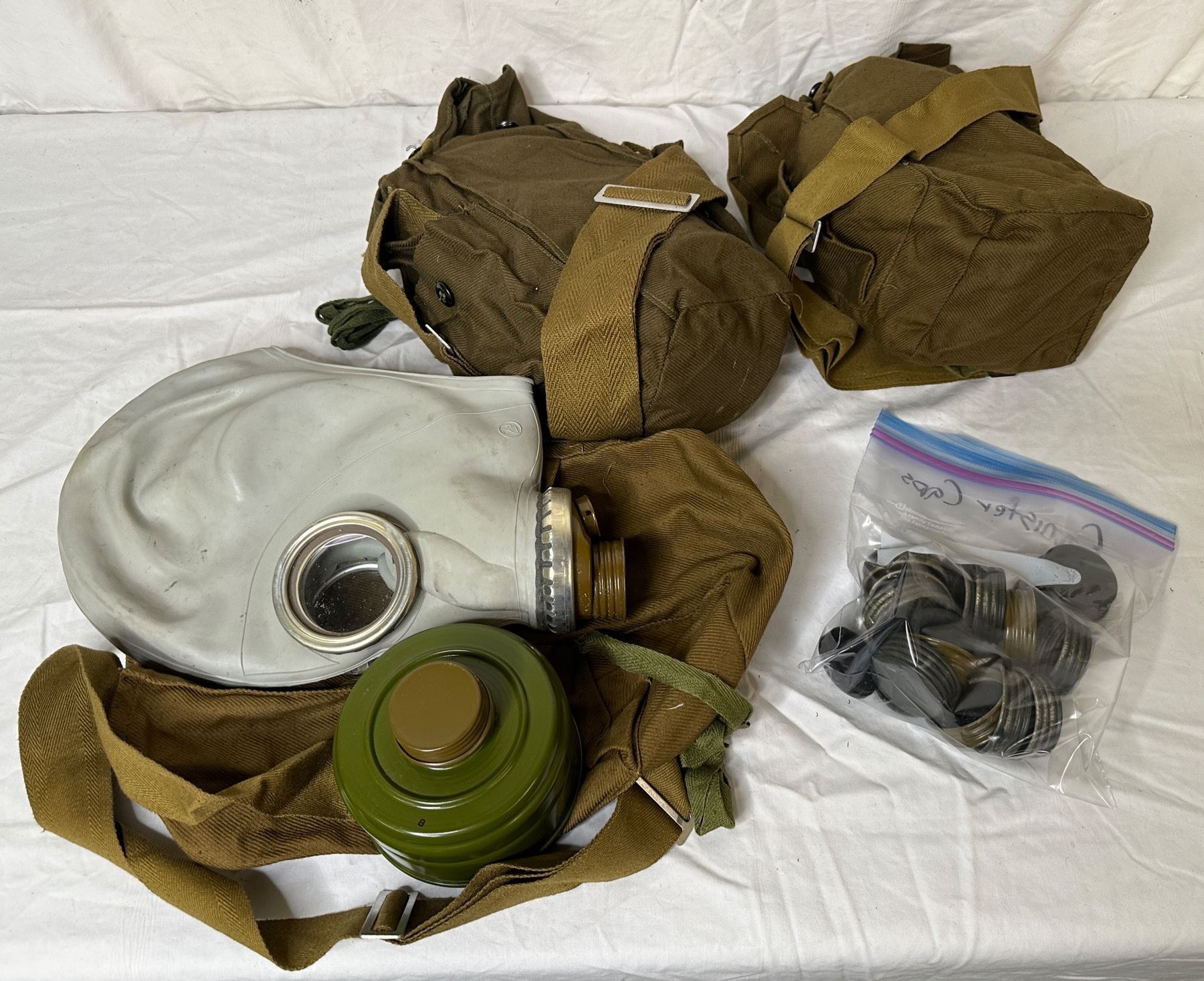 Set of 3 military prop gas masks w/ bags & extra cannister caps
