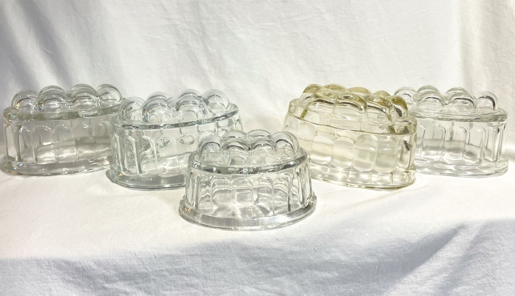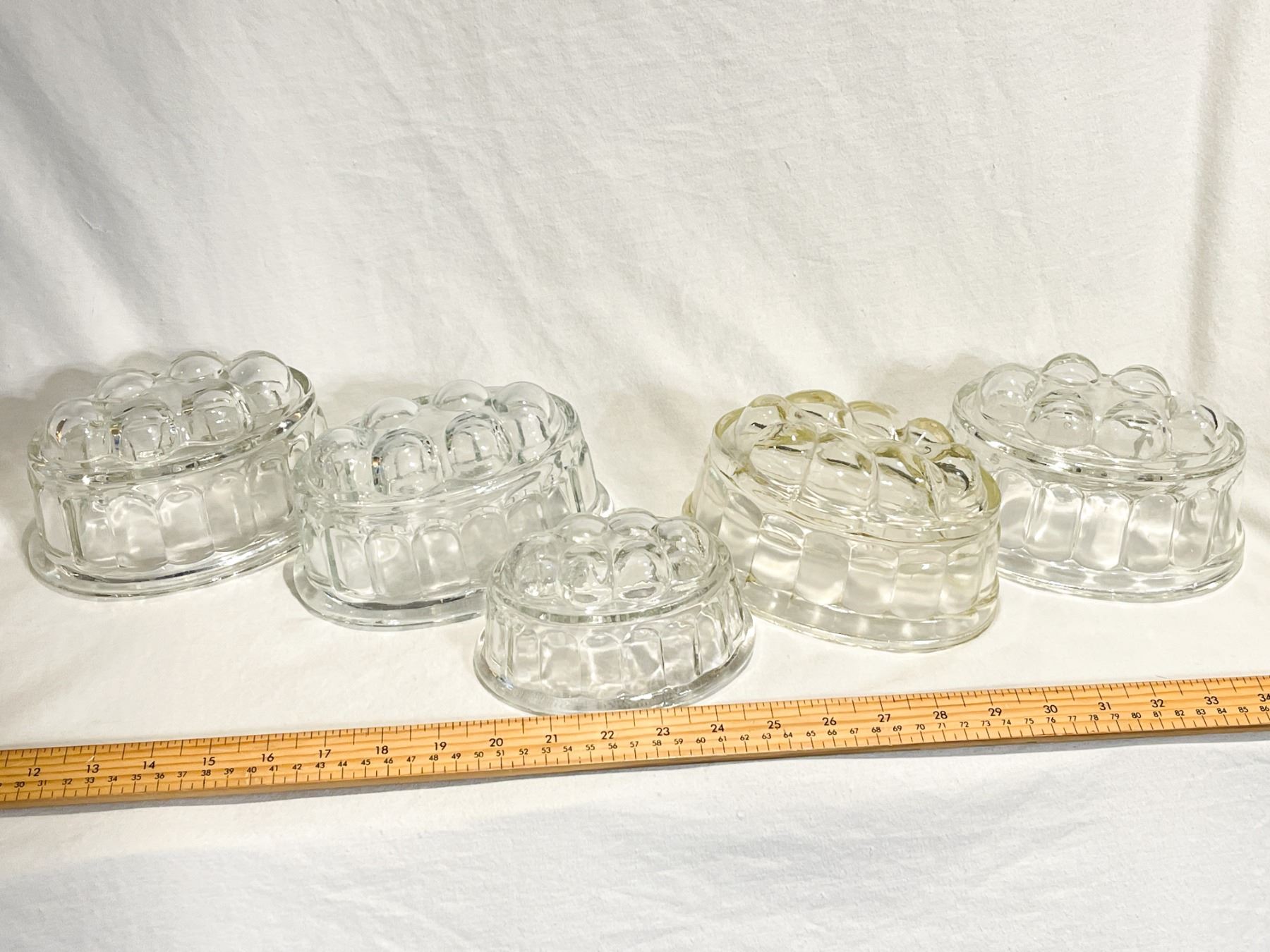 Collection of five vintage pressed glass jelly molds in assorted sizes and shapes. Each features a classic domed or fluted design, perfect for traditional molded desserts or as charming kitchen display pieces.
