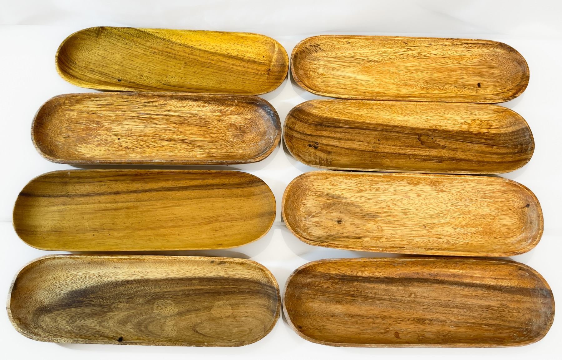 Set of eight vintage teak wood trays from Tap Phong Trading Co., featuring beautiful natural grain patterns and warm golden-brown tones. Each piece is hand-finished and uniquely varied in color. The finish is inconsistent and would benefit from light refinishing or can be periodically oiled to retain a uniform sheen. Ideal for serving appetizers, displaying collectibles, or even as long plates.