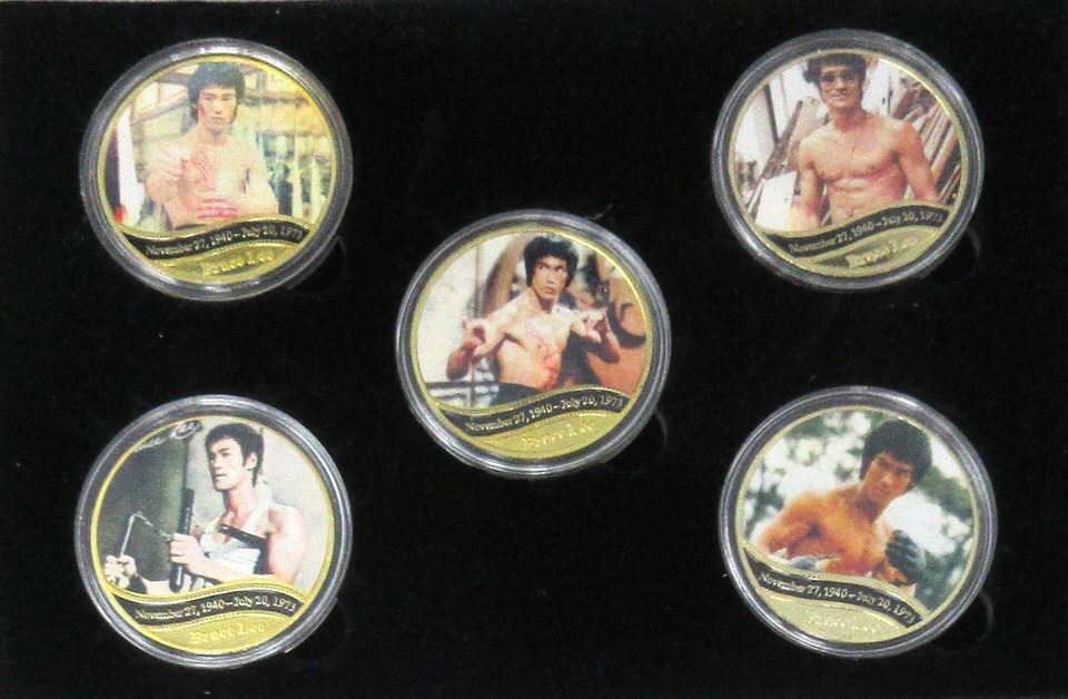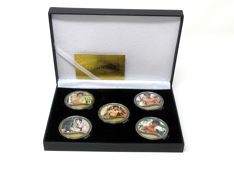 Bruce Lee and Dragon in gold on one side and a coloured gold embossed photo on the other. Ltd. Edition with certificate of authenticity.