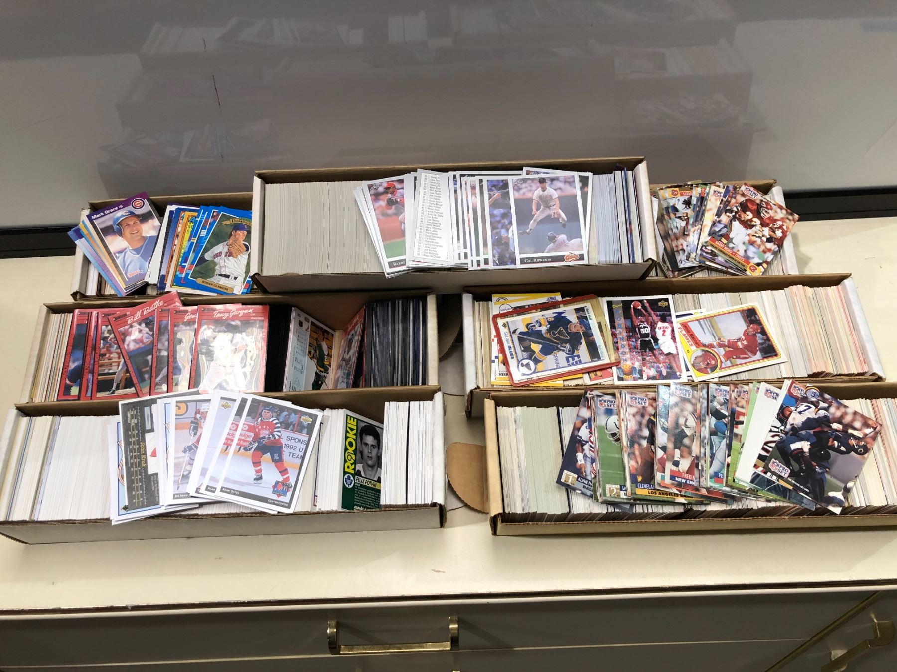 Seven full boxes of assorted sports collectors cards - Hockey/Football/Baseball/Basketball