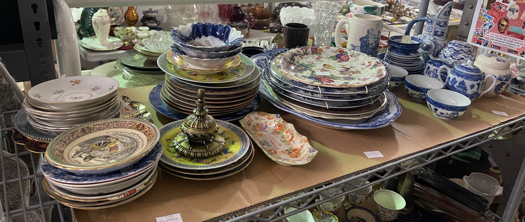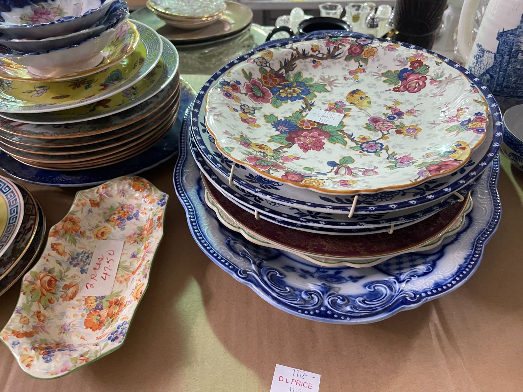Shelf Lot - Large Floral Plates & Blue and White China Heavy stack of colorful floral and patterned plates, bowls, and teaware