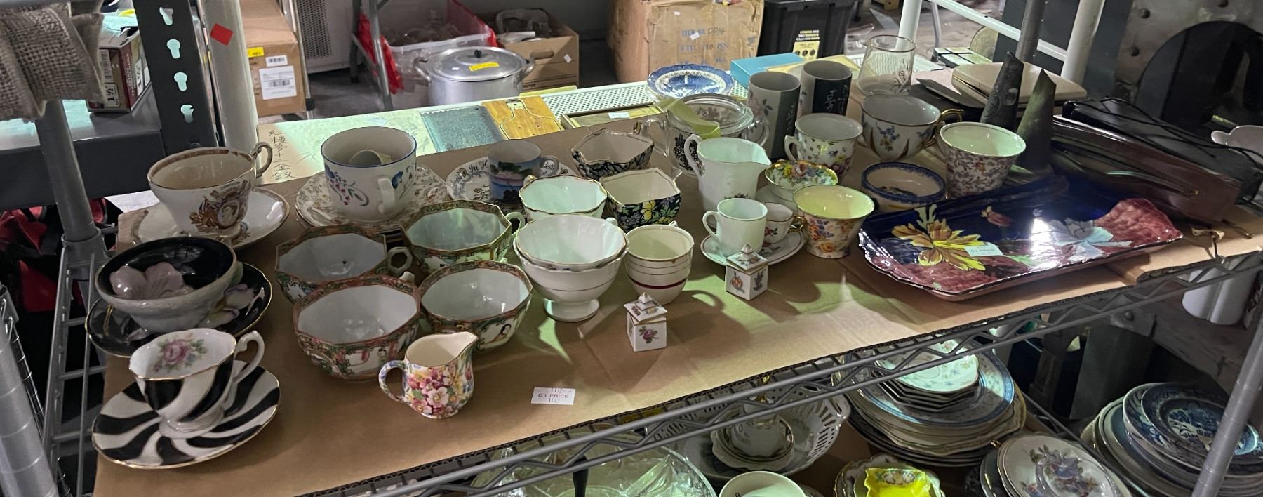 Shelf Lot - Teacups, Creamers, Porcelain Mugs & Tray Delicate porcelain teacups, creamers, glassware, and decorative serving tray.