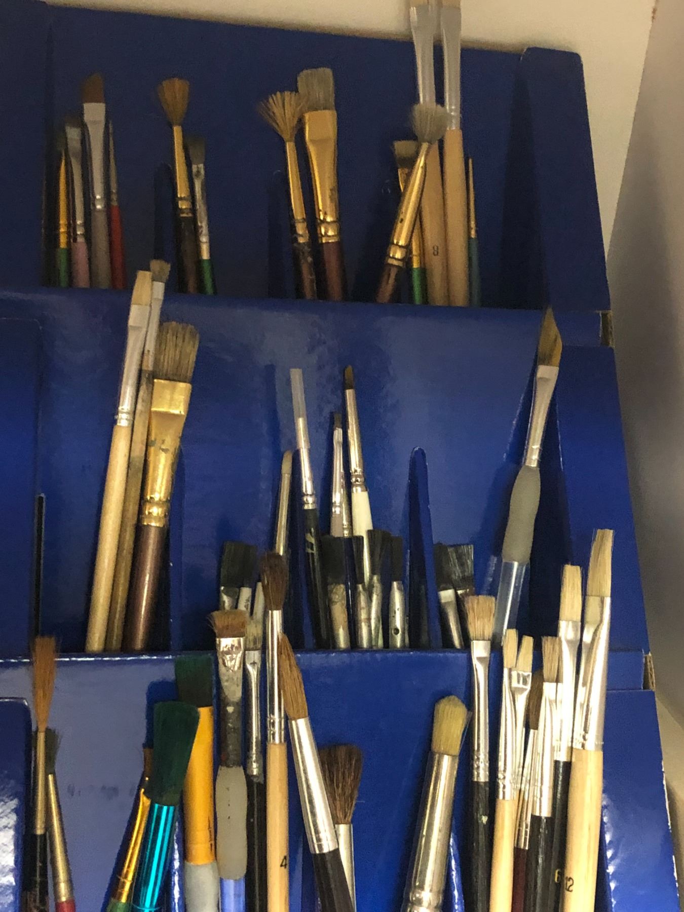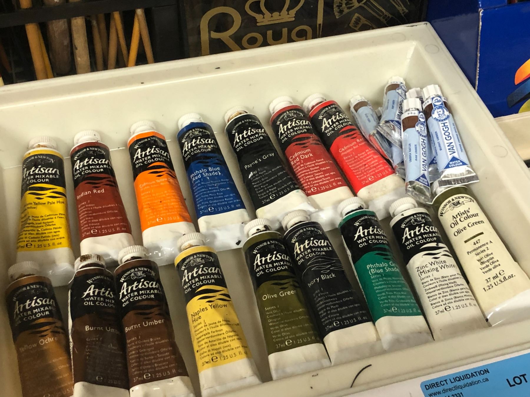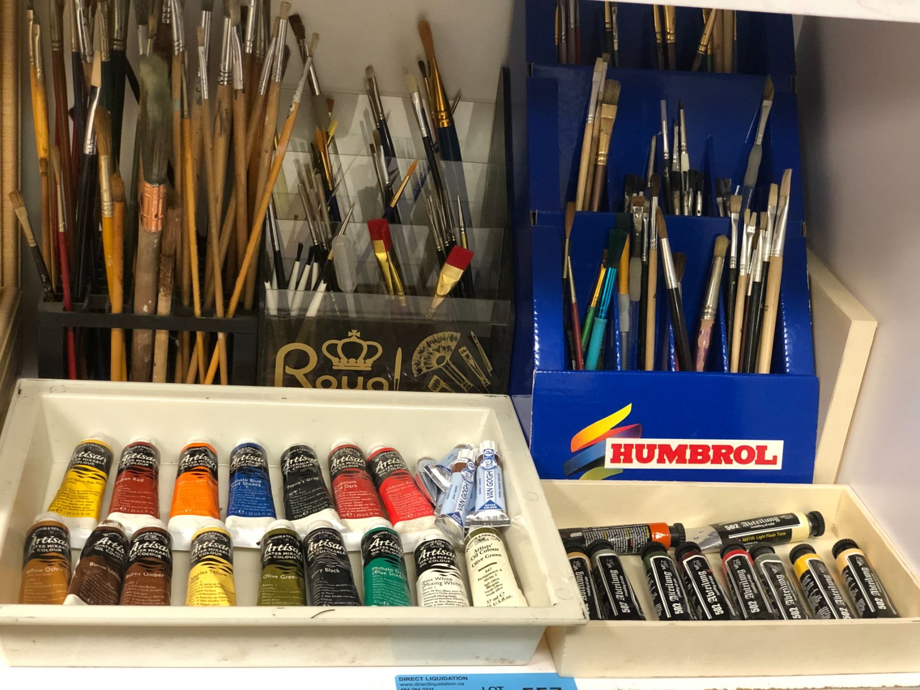 Shelf Lot of Artist Supplies - Oil and Watercolour Paints and Brushes. Large variety of brushes. Windsor & Newton, Van Gogh and Abteilung paint.