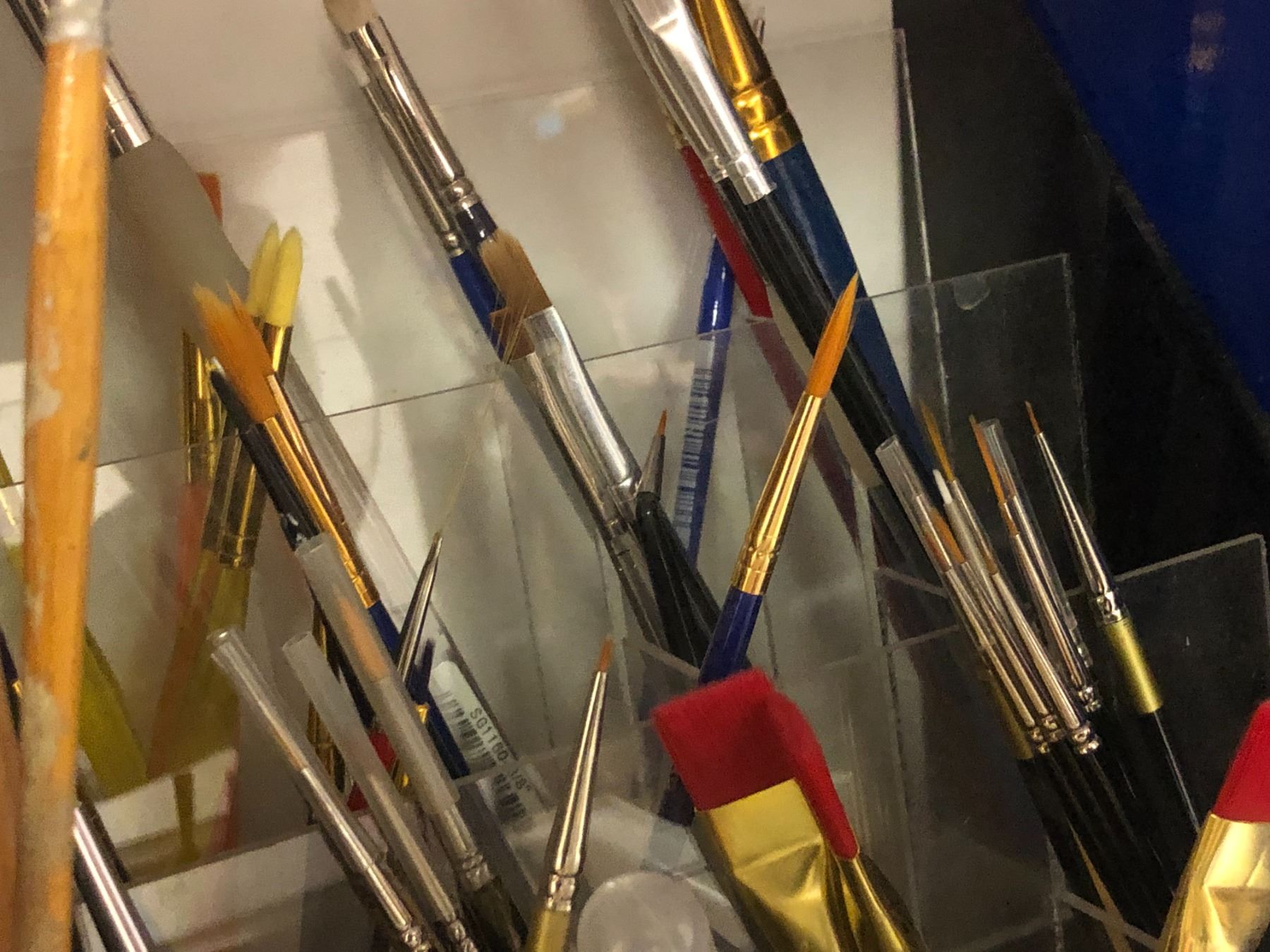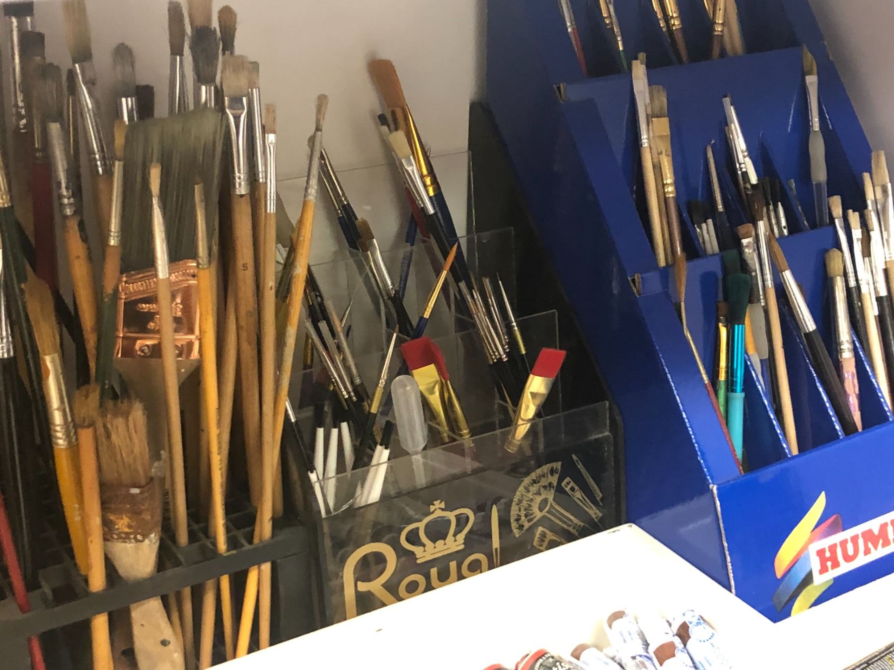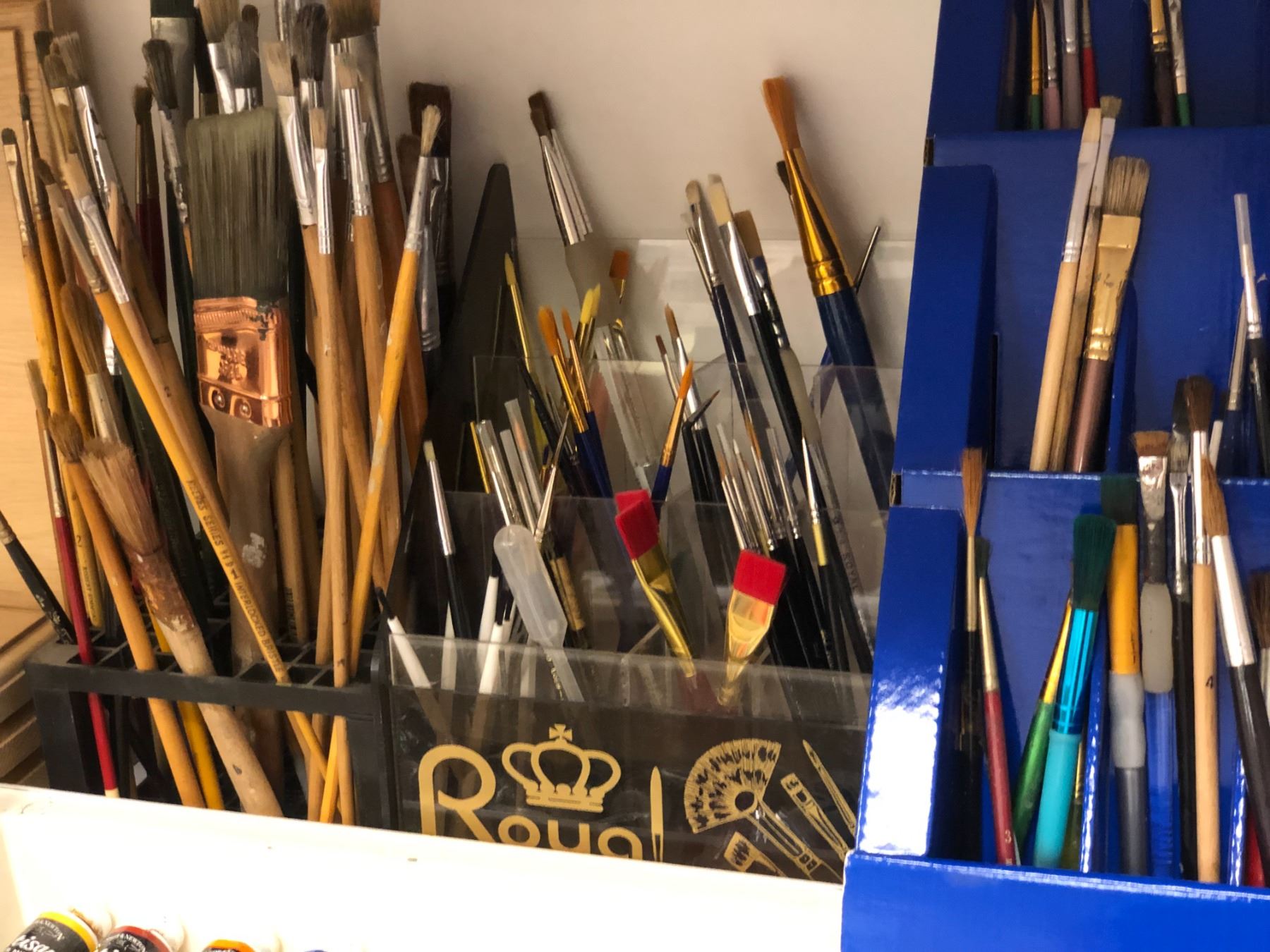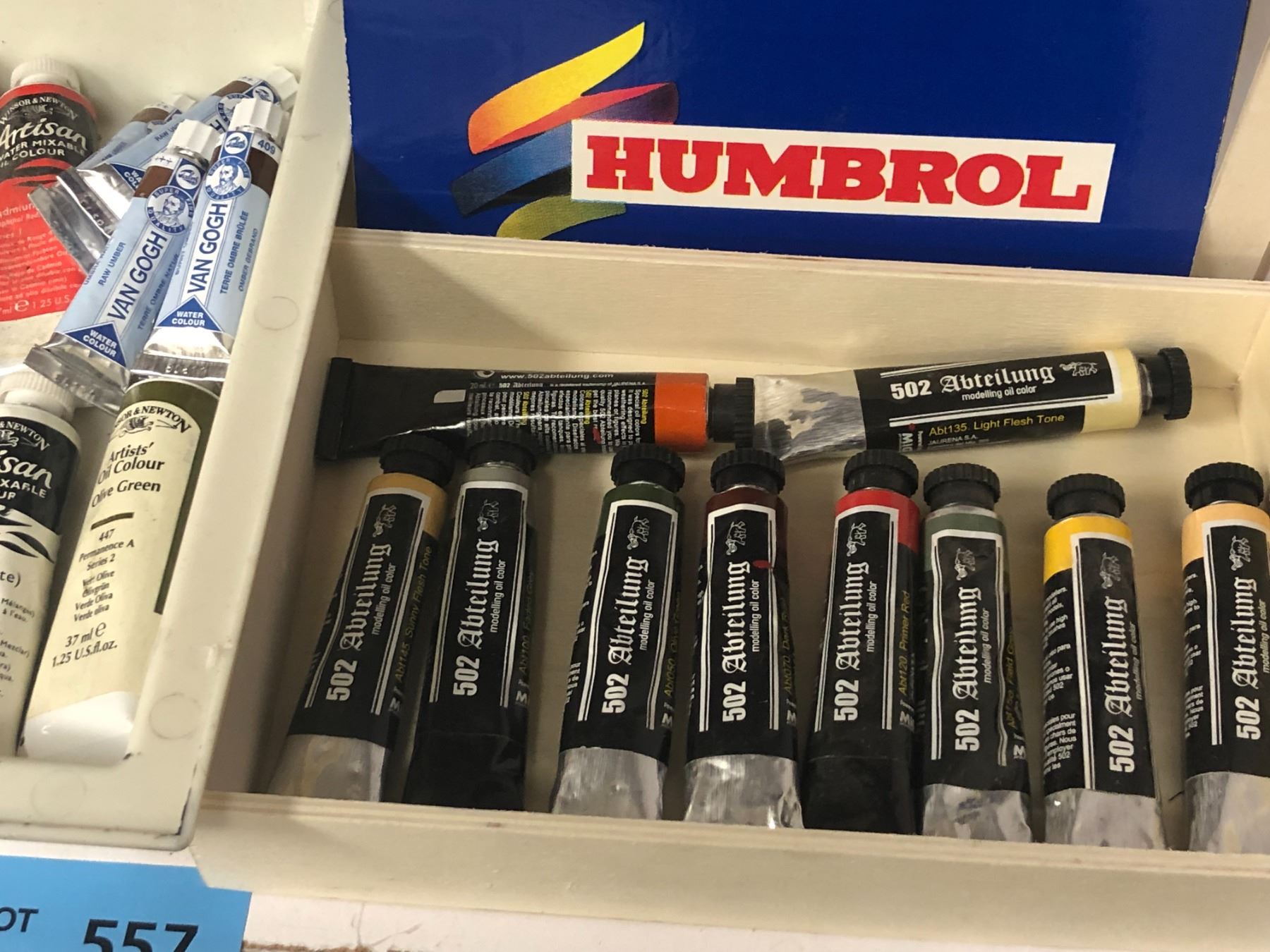 Shelf Lot of Artist Supplies - Oil and Watercolour Paints and Brushes. Large variety of brushes. Windsor & Newton, Van Gogh and Abteilung paint.