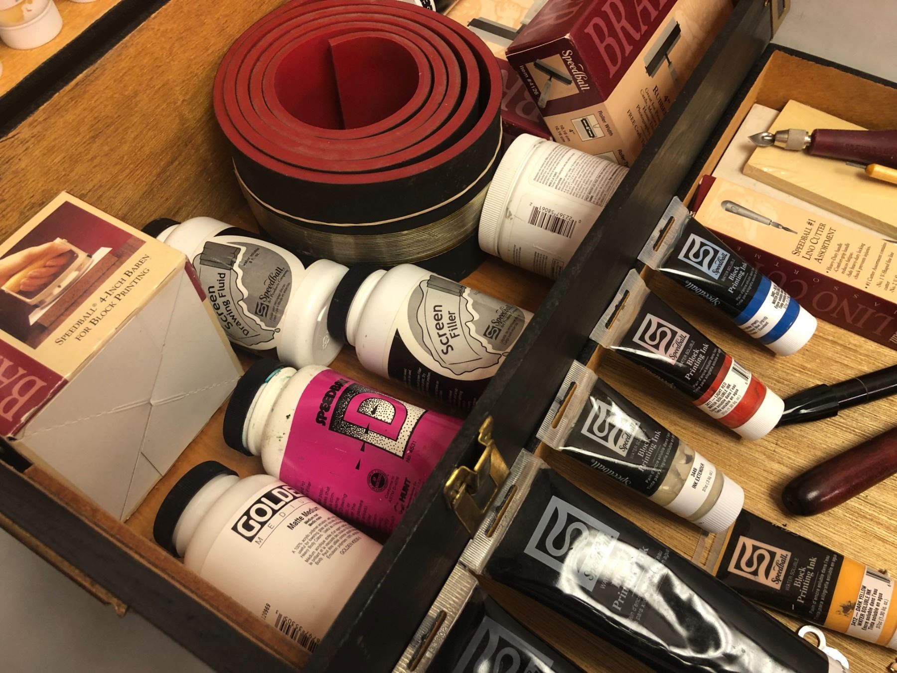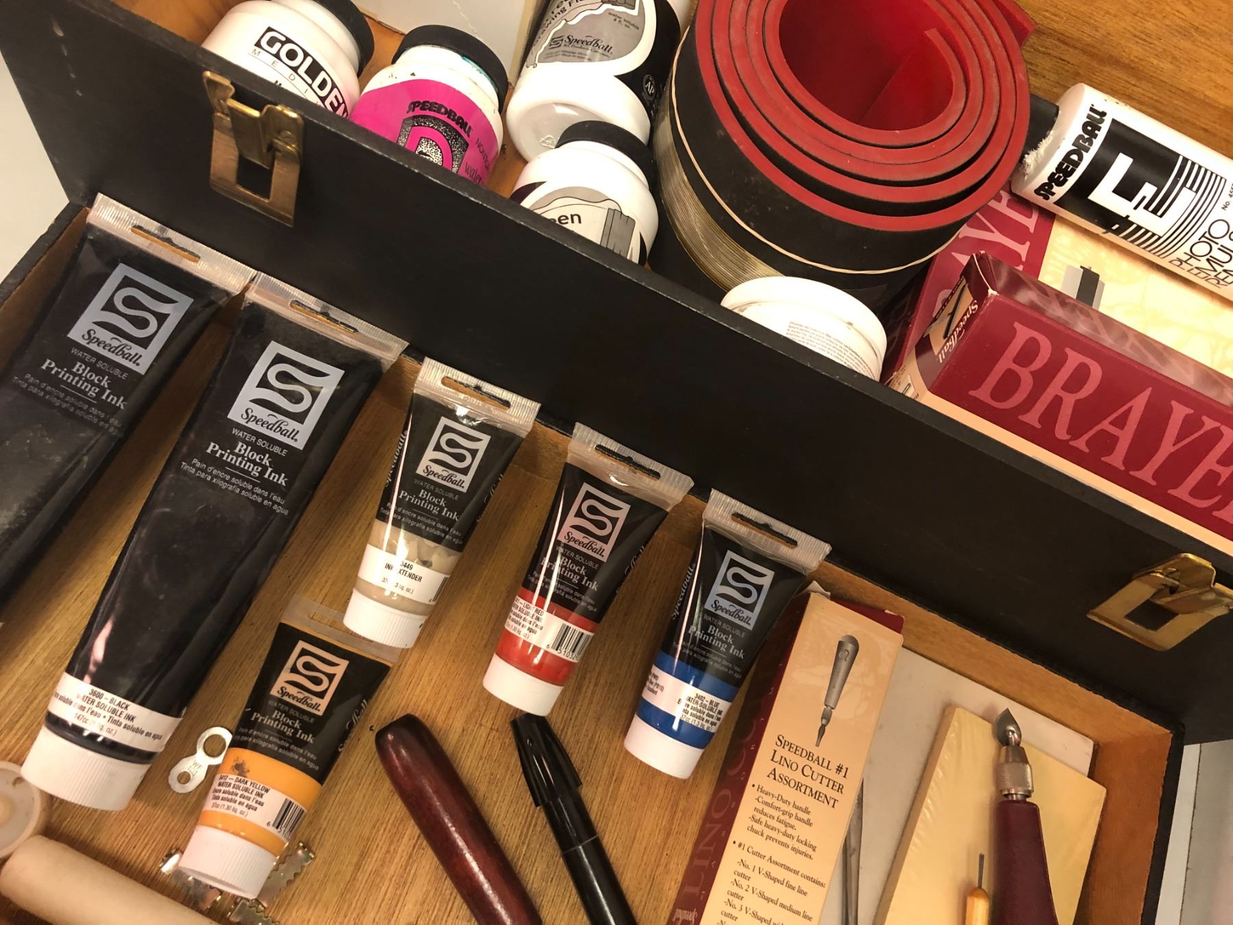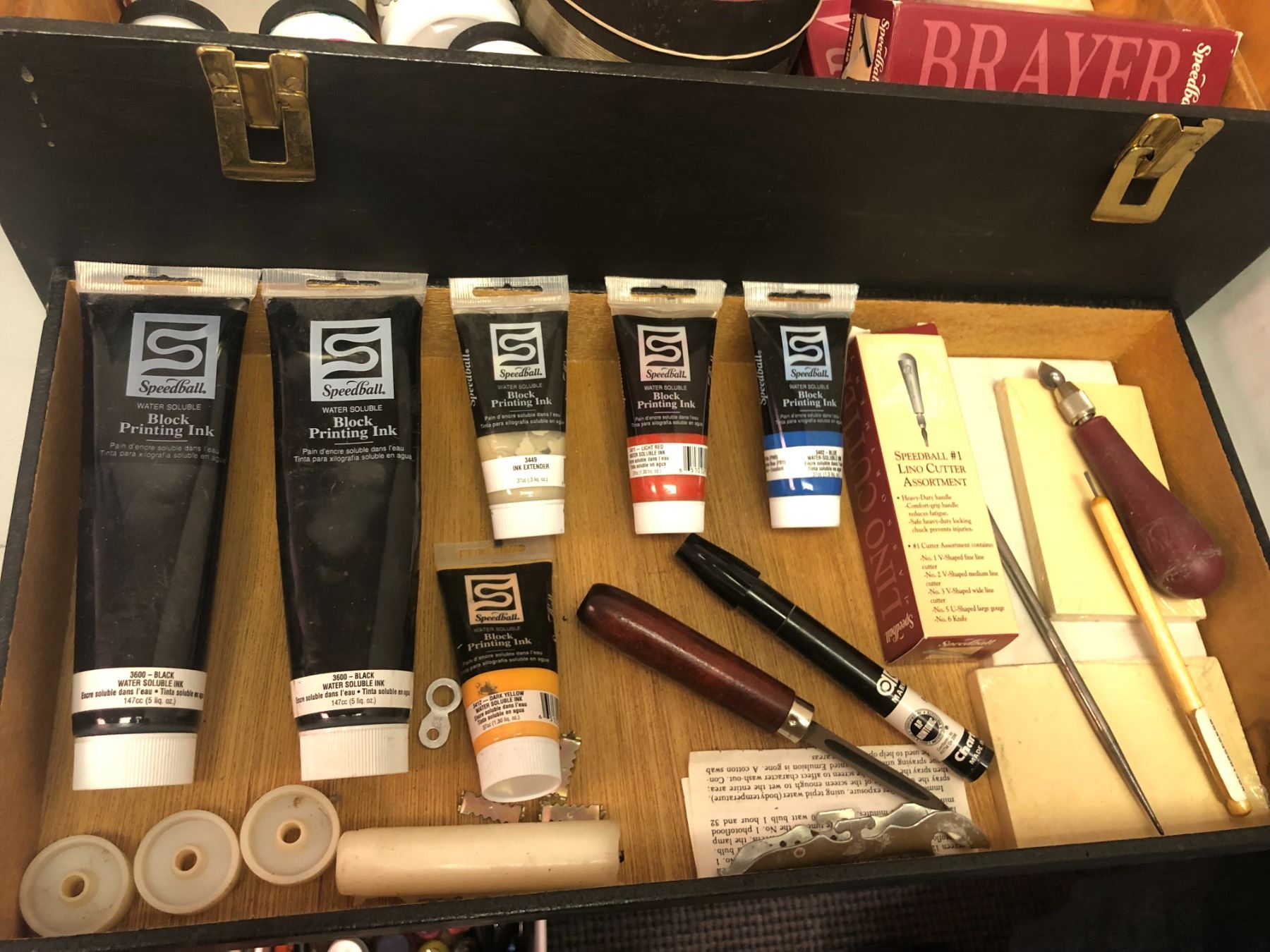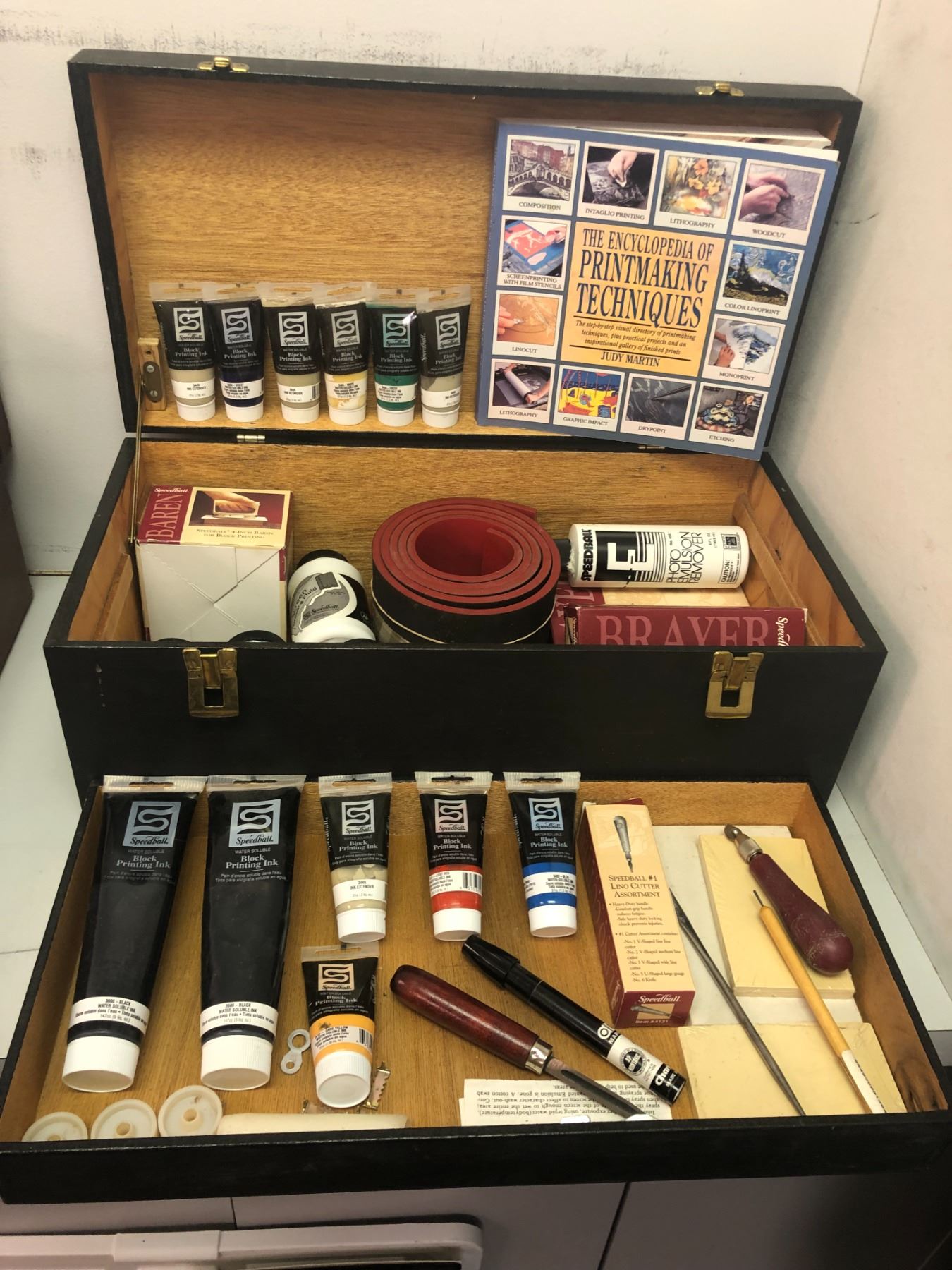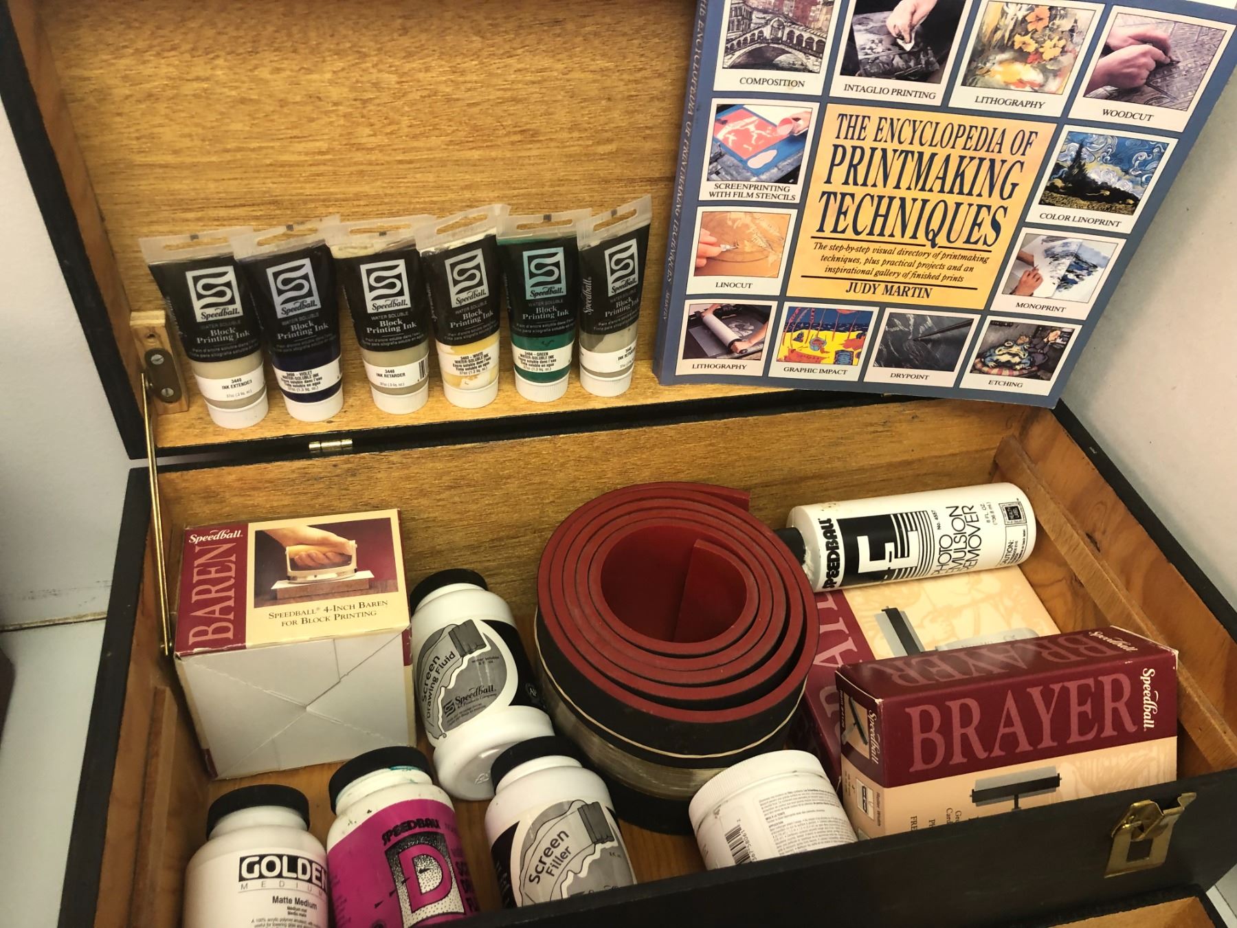 Shelf Lot of Artists Supplies - for Printmaking Supplies, including case, booklet, inks, cutters, Brayer, rubbers, stamps