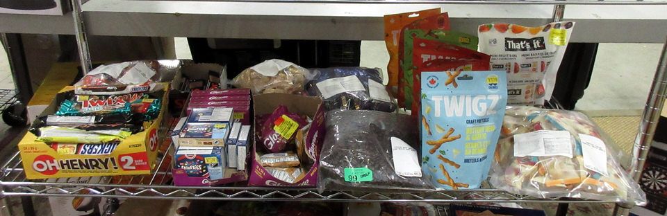 3 Boxes of assorted chocolate bars & candy bars, 7 x 130 g bags of assorted Twigz pretzels, 0.902 kg bag of Ethical Bean lush medium roast whole coffee beans, 0.874 kg bag of Tropical Fields tropical fruity boba candy & more. All BB dates are good.