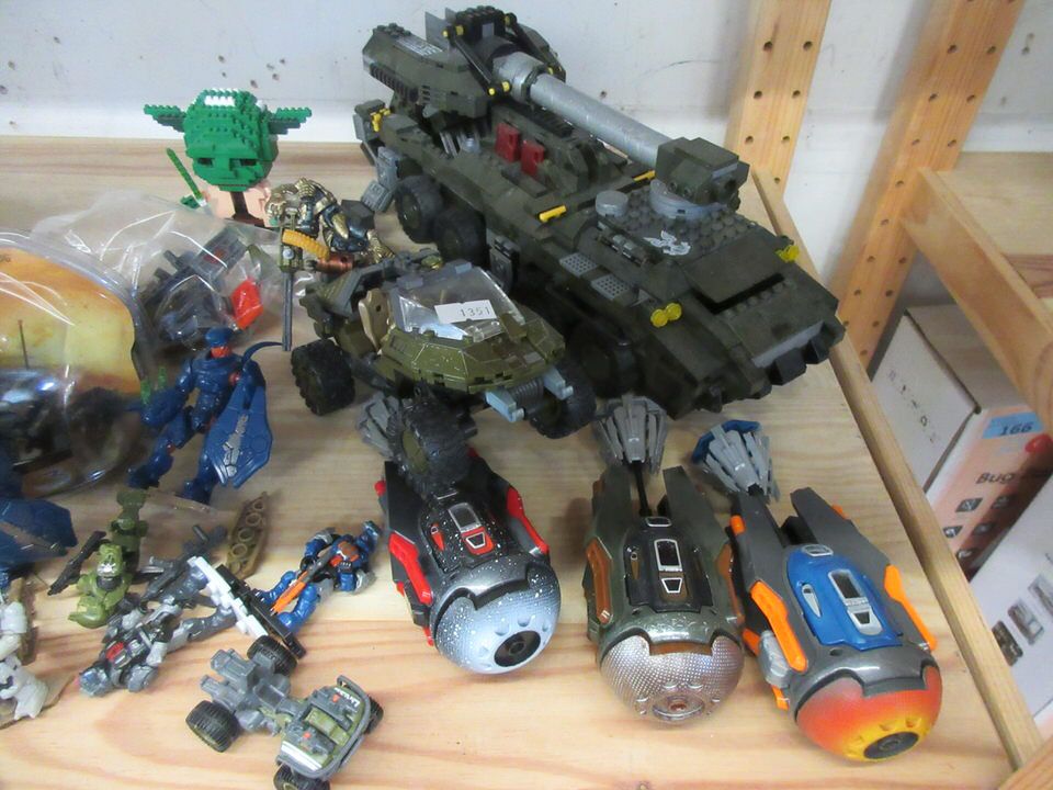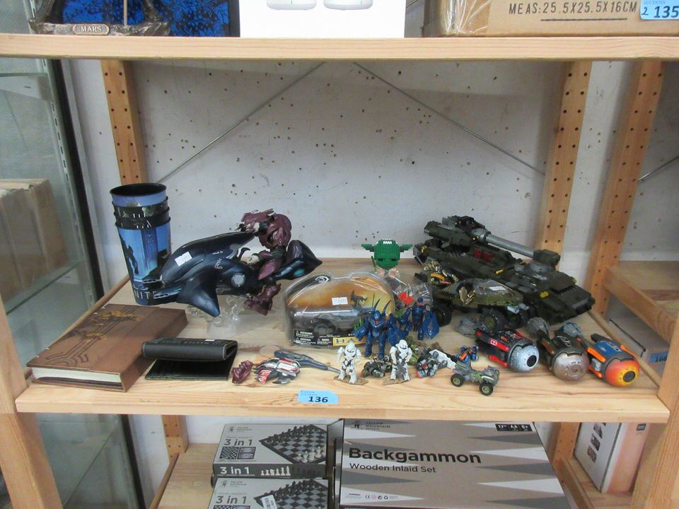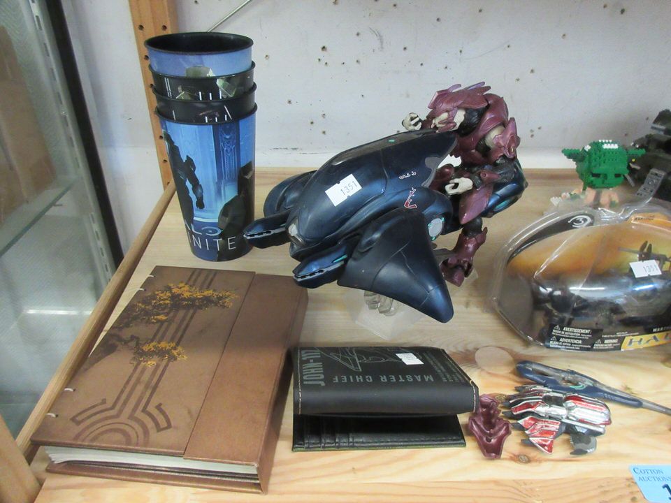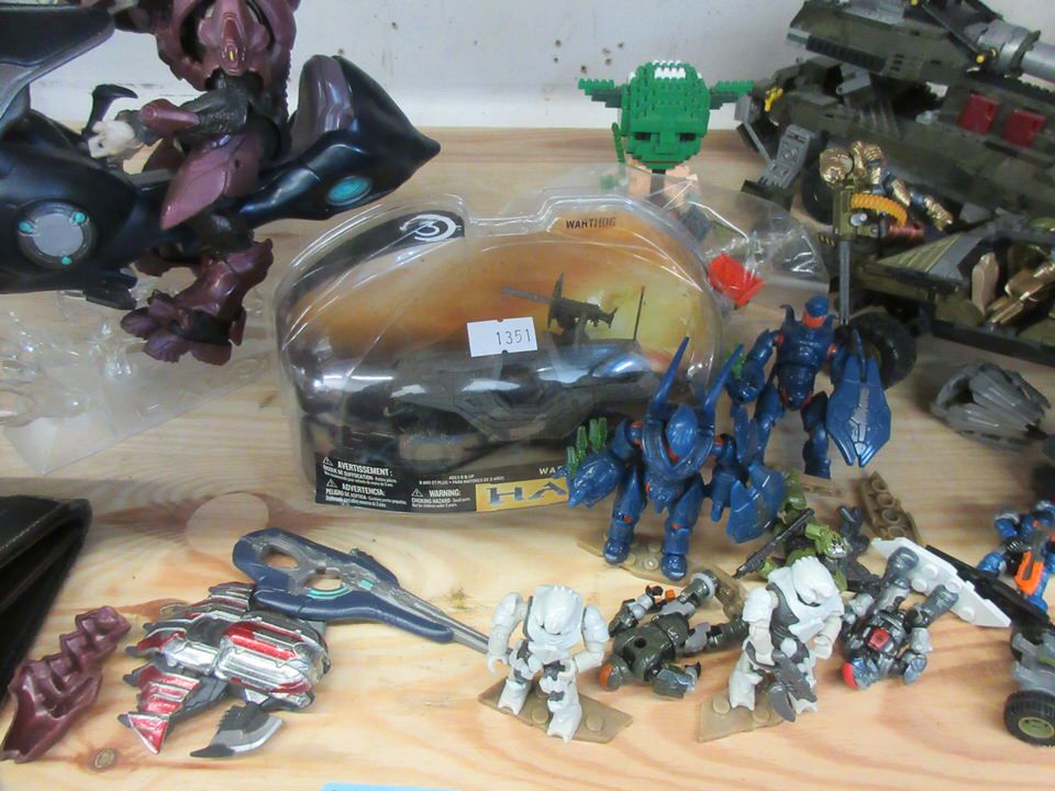 Mega Bloks, wallet, 4 beverage cups, Warthog, Catherine Halsey book, and action figure on vehicle.