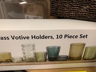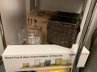Shelf Lot of House Décor Items - Basketx, Votive Holders & Glass Jar