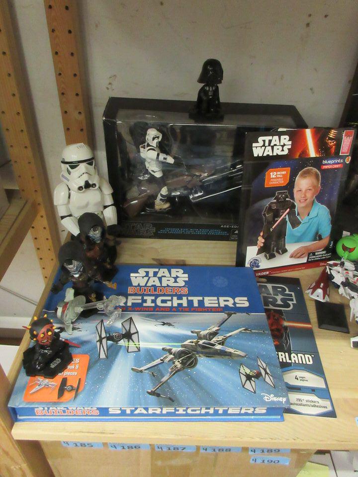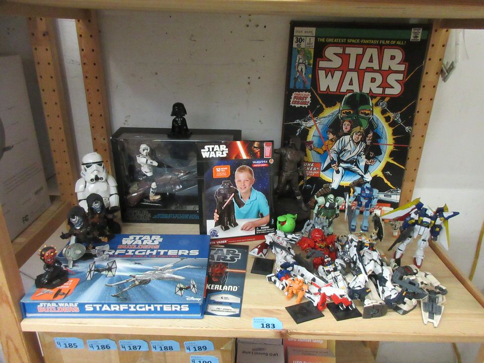 Star Wars comic print on board, paper blue prints, Stickerland book, Star Fighters builders book, figurines, Gundam action figures & more.