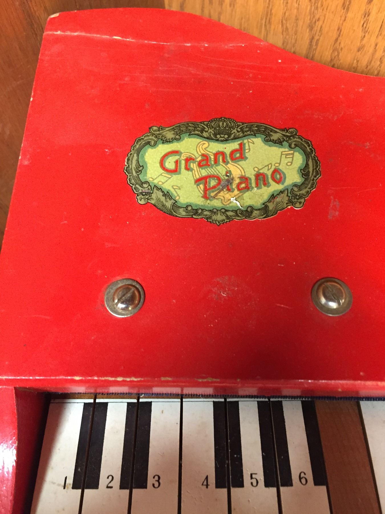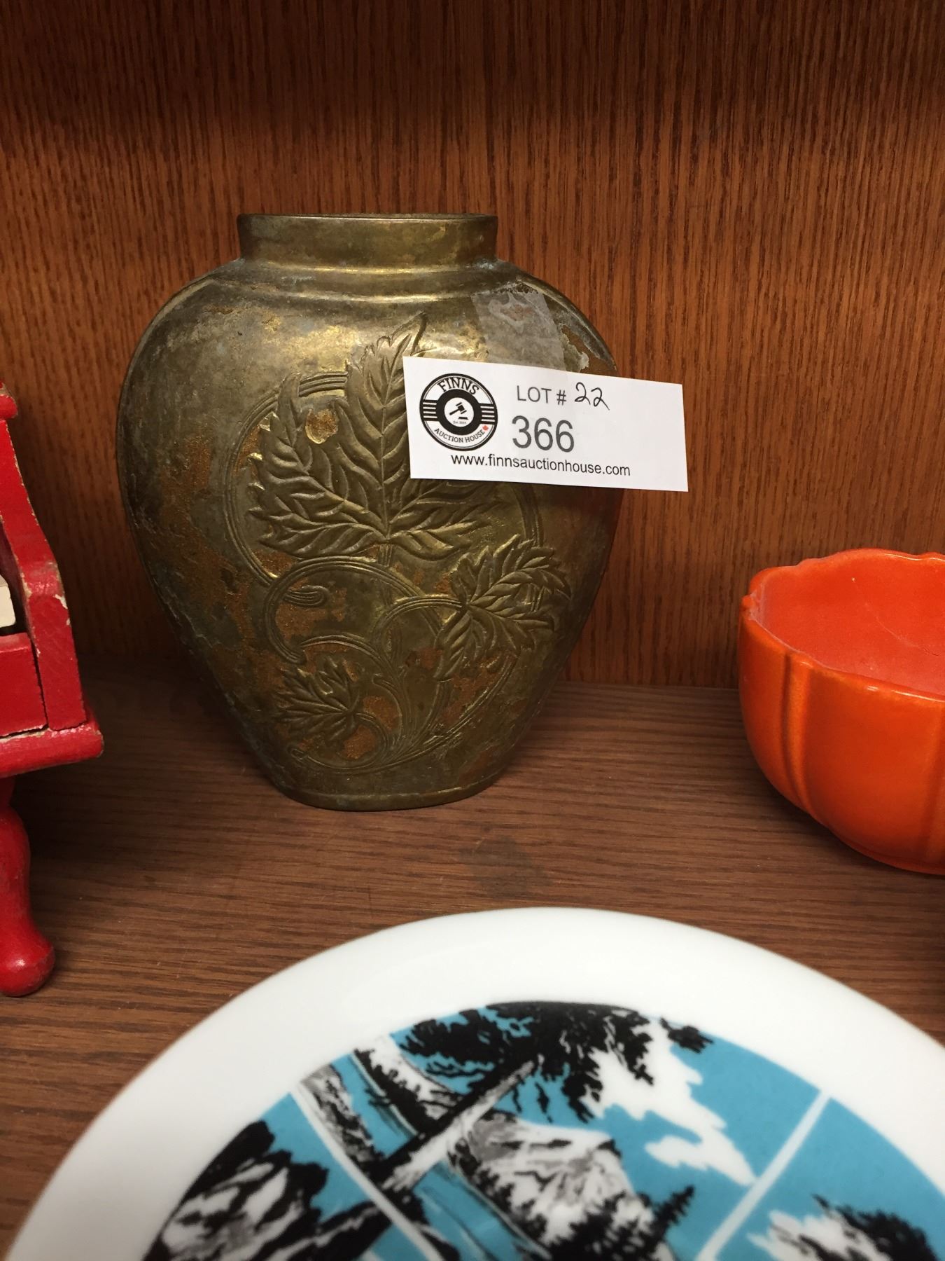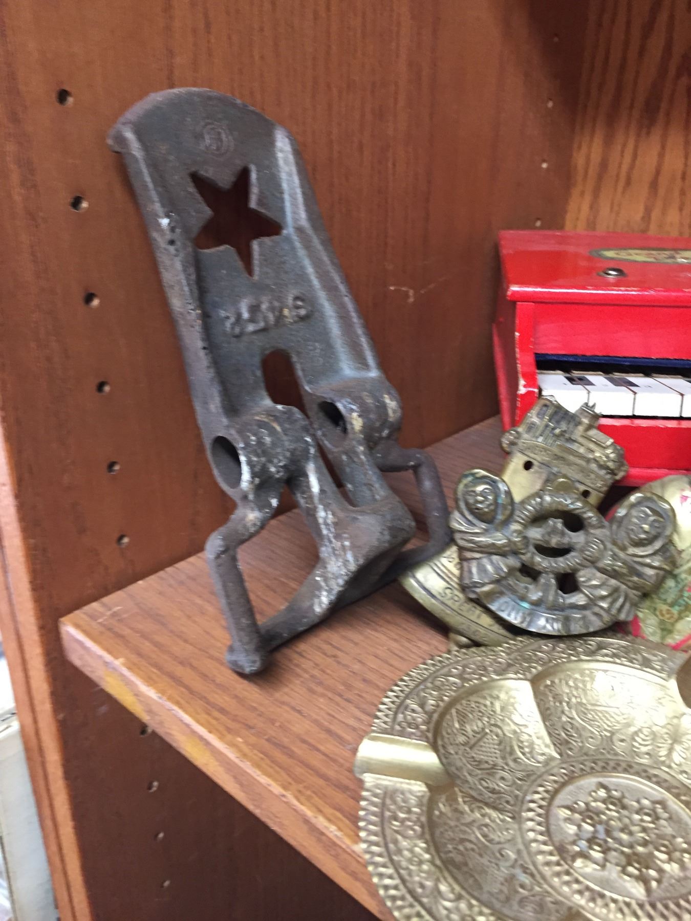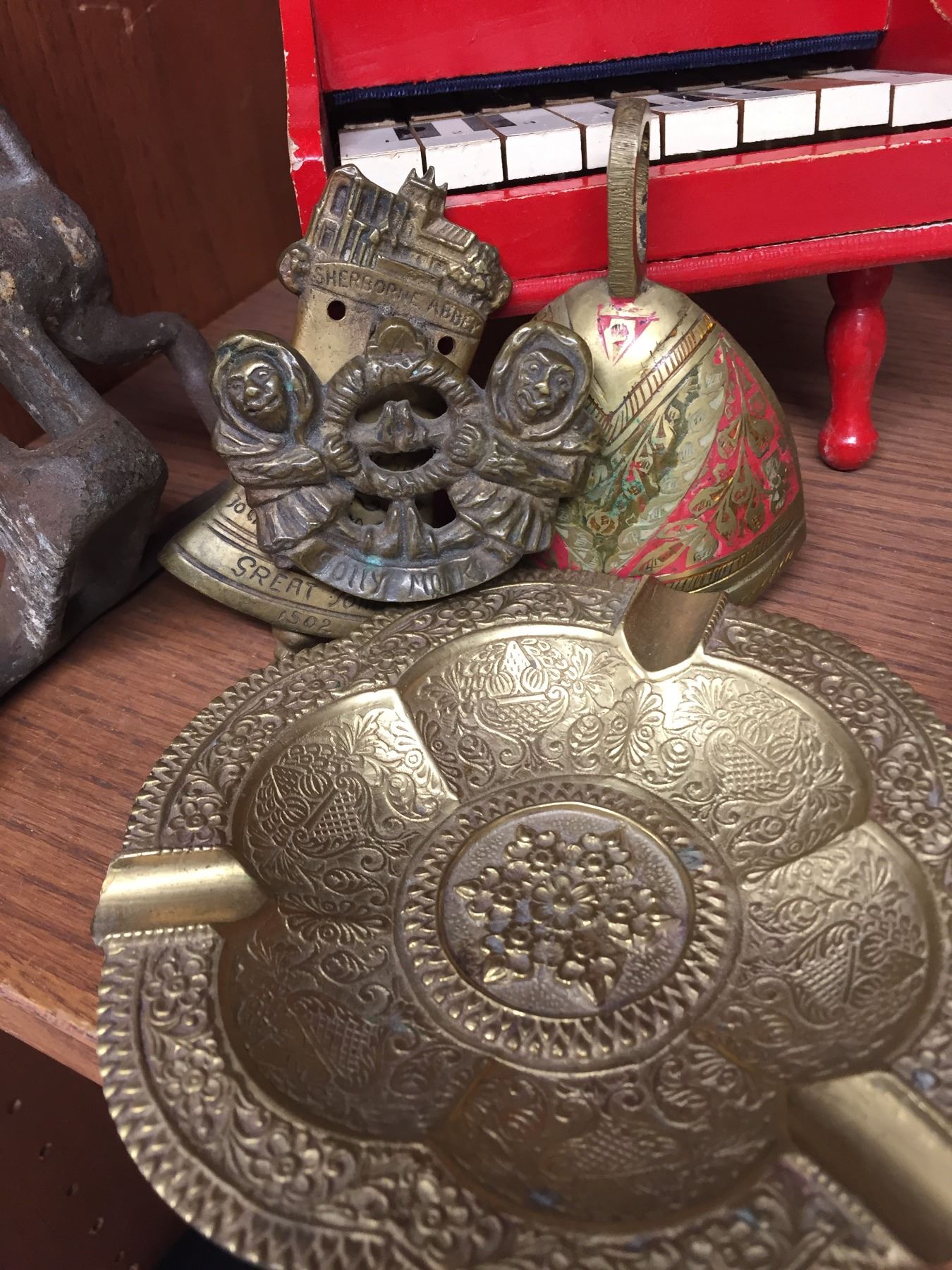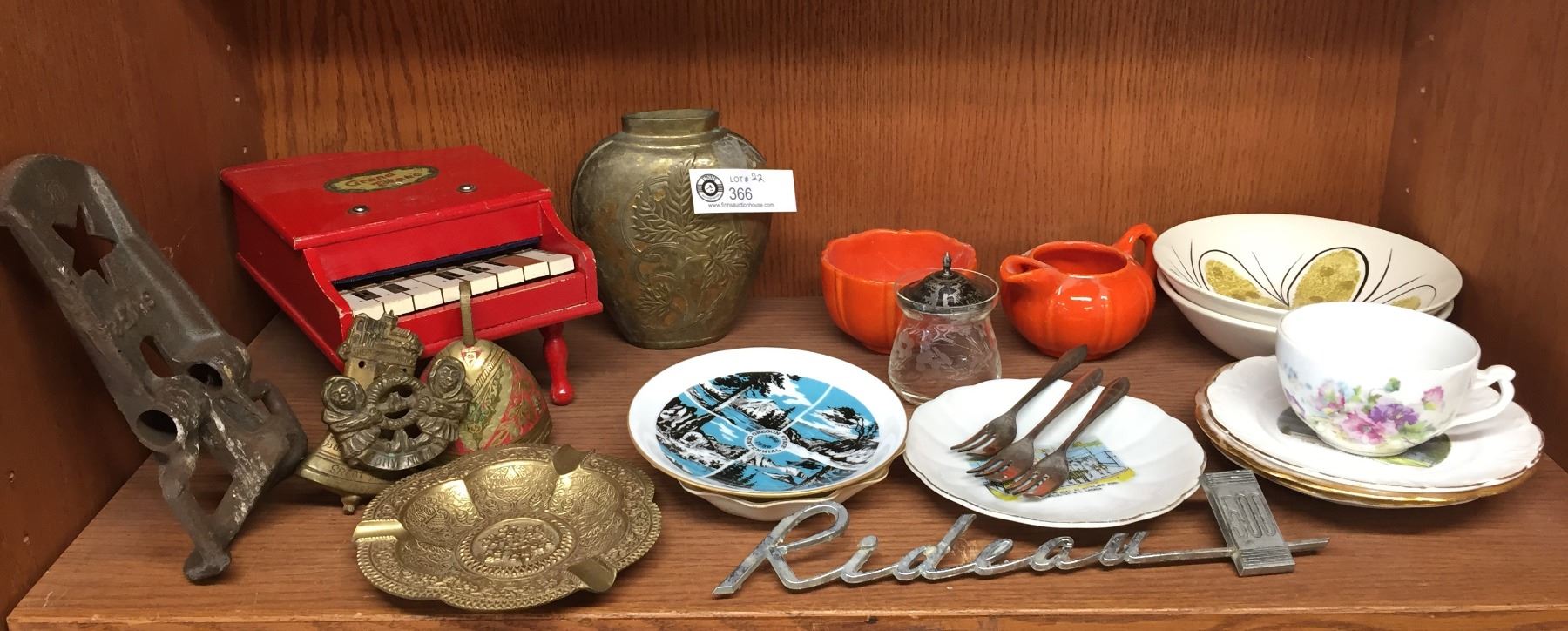 Shelf Lot of Vintage Brass Vase, Ashtray, Doorknocker, Dishes, Kids Toy Piano