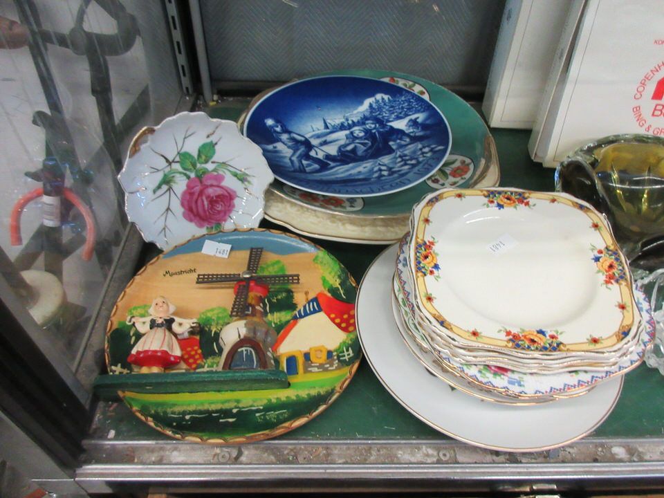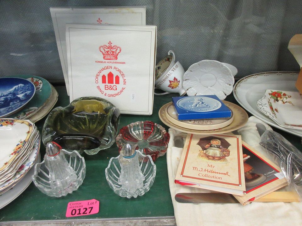 Sheffield England knives, silver plated teaspoons, glass ashtrays, collector plates, Hummel coasters, and more.