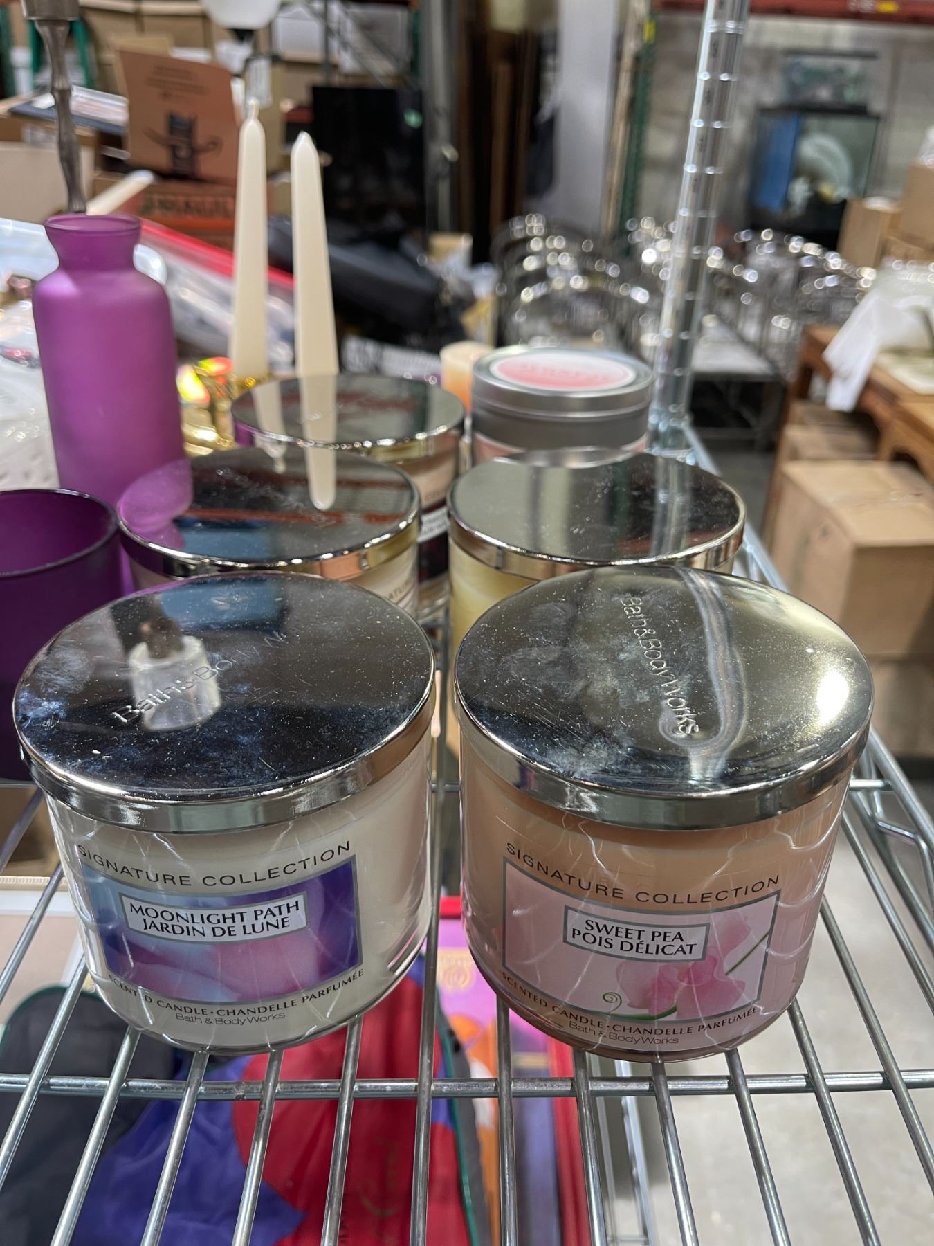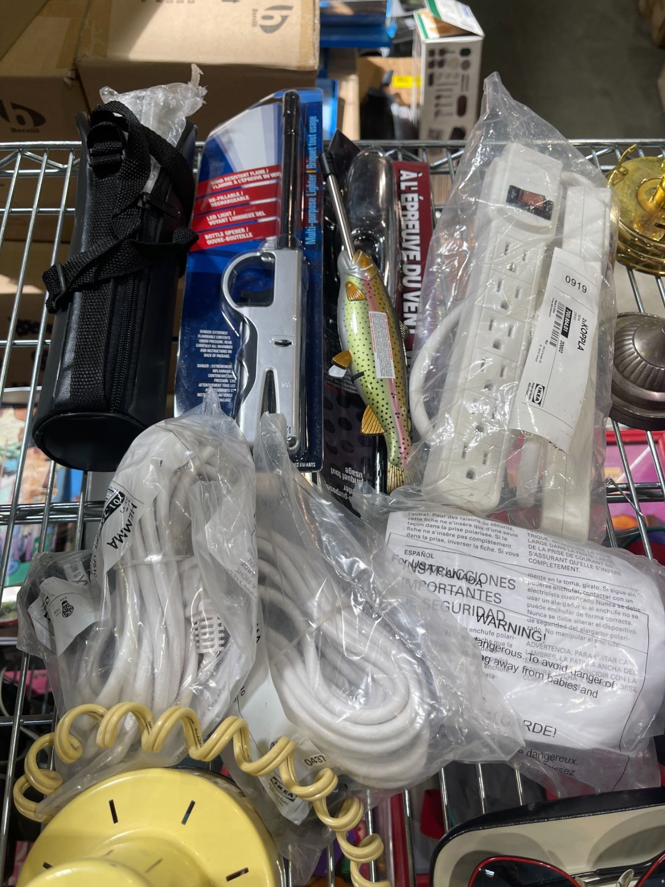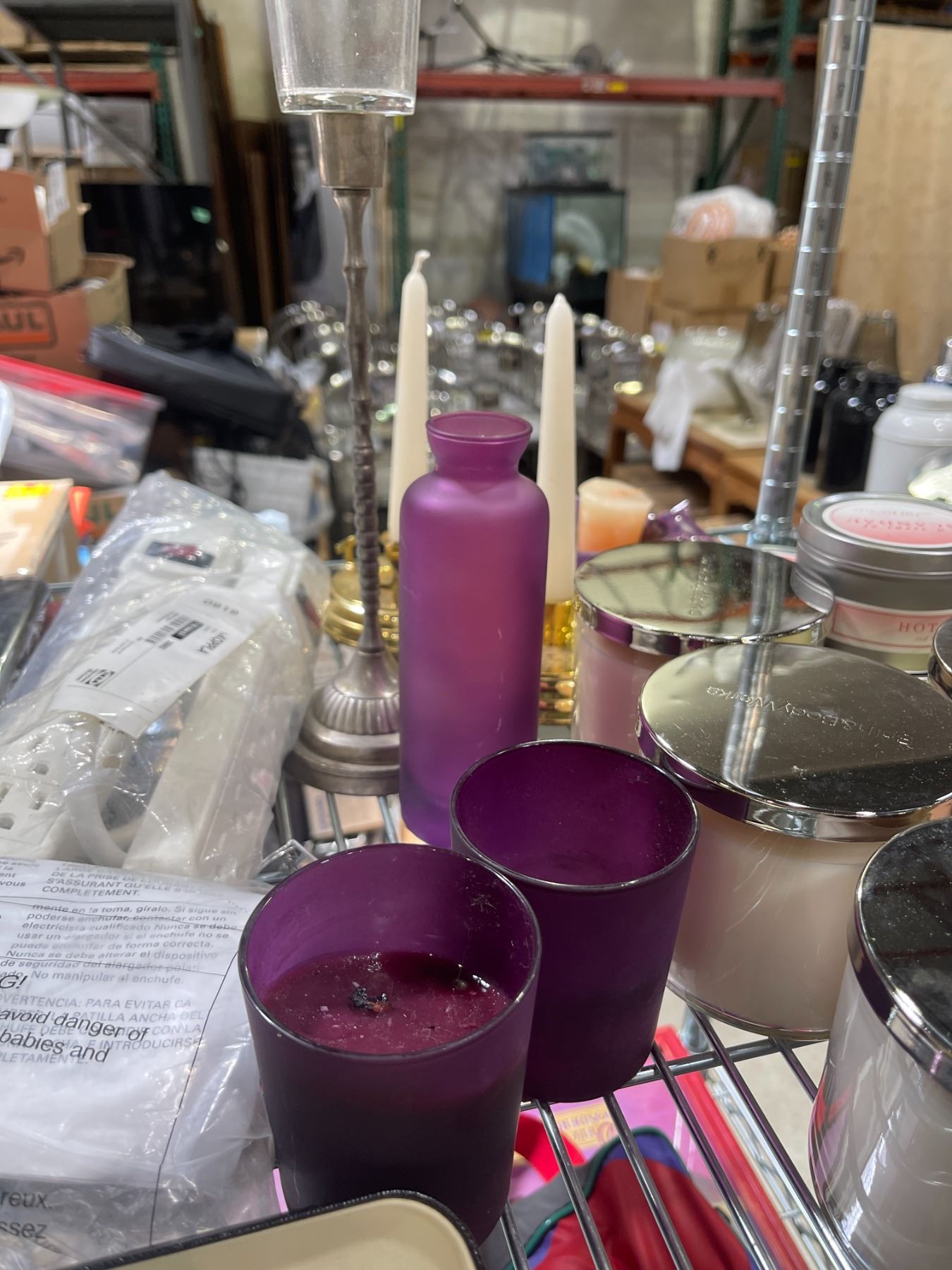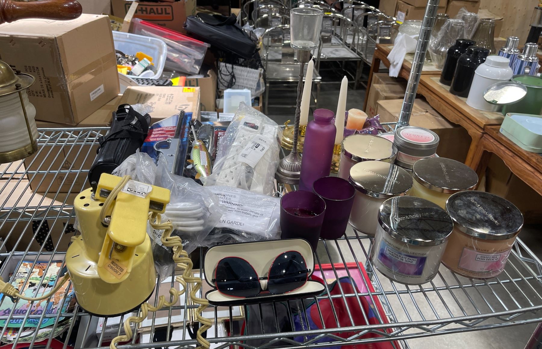 Shelf lot - Misc items including candles, light, power bar, lighters & candle holders