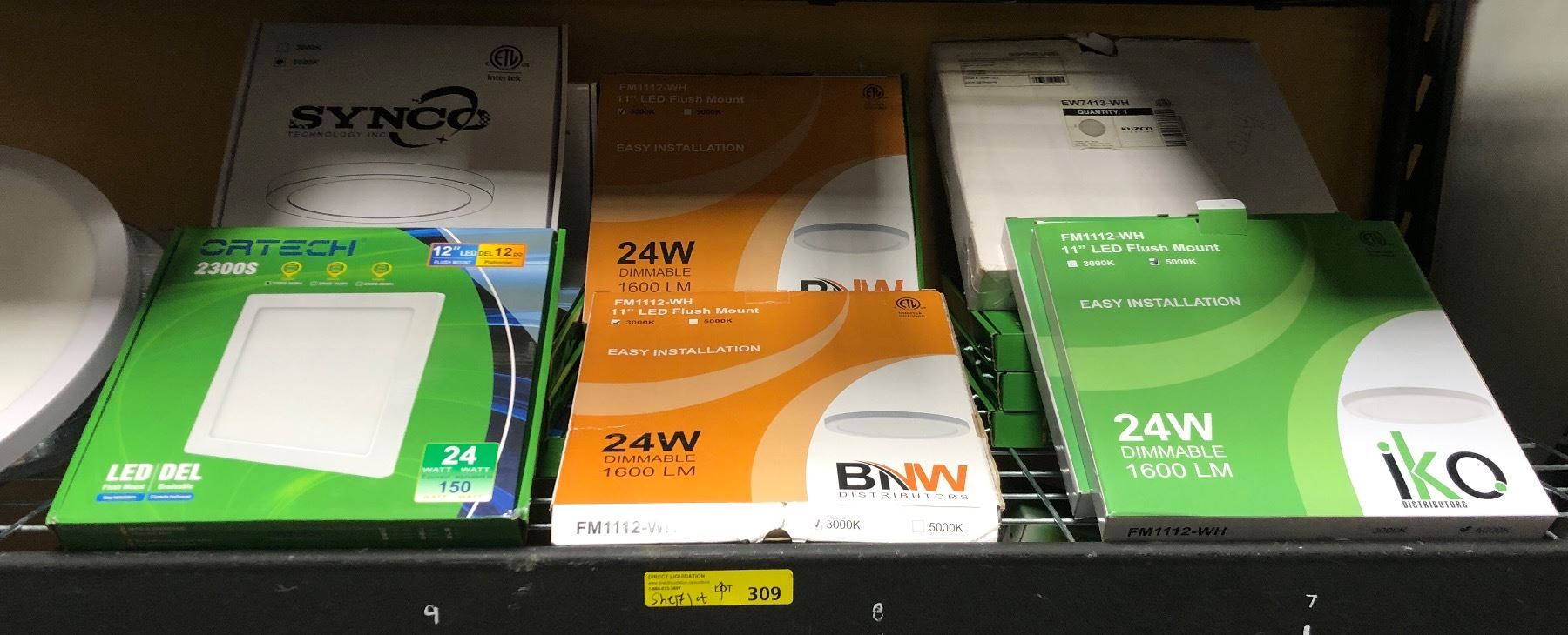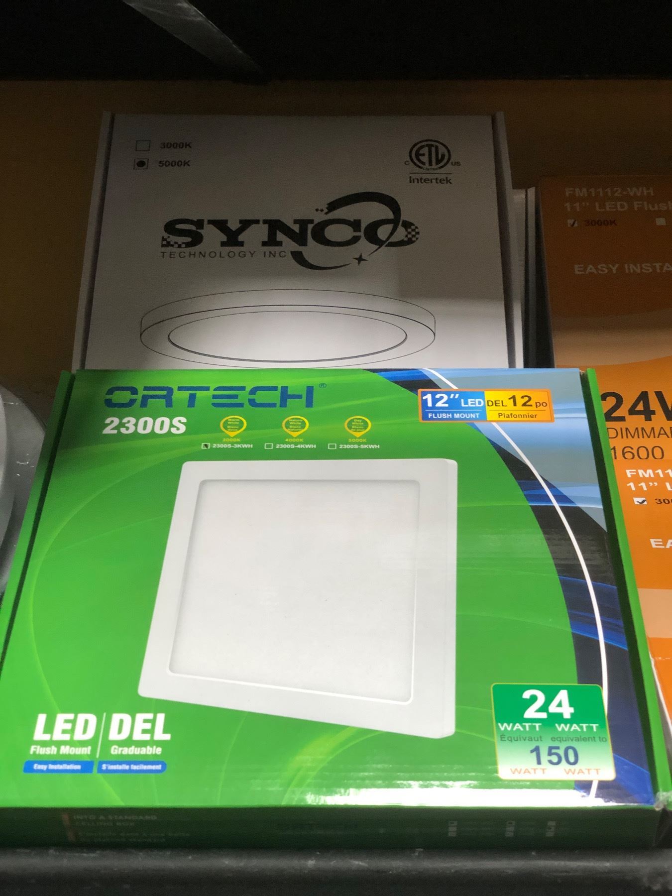 Shelf lot full of assorted lighting 11in LED flush mounts, ceiling lights (all brand new in box)