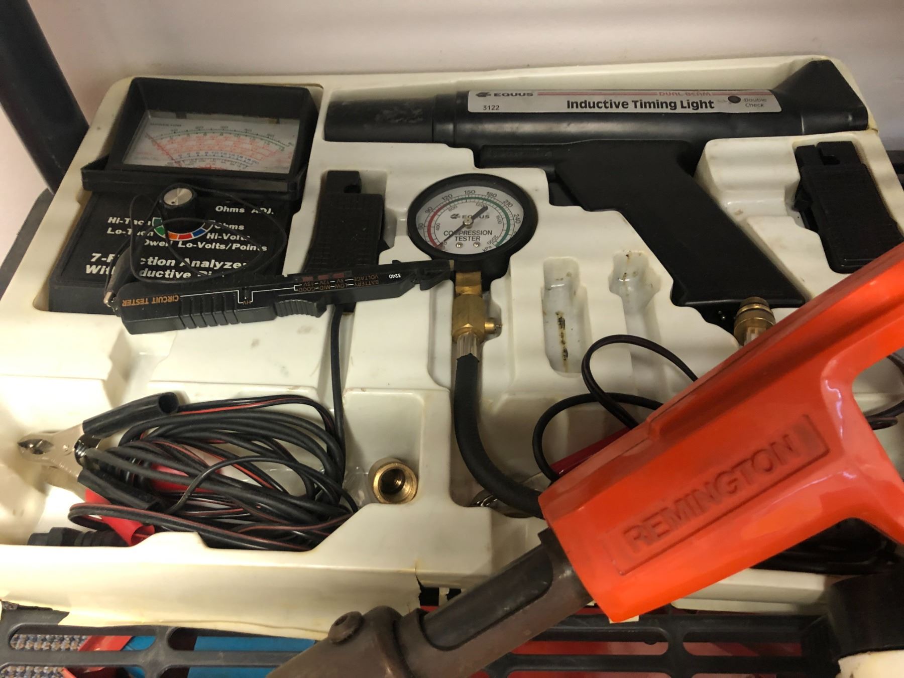 Shelf lot of 4 assorted items - timing light/ work light/ electric barrel pump & Remington powder actuated tool