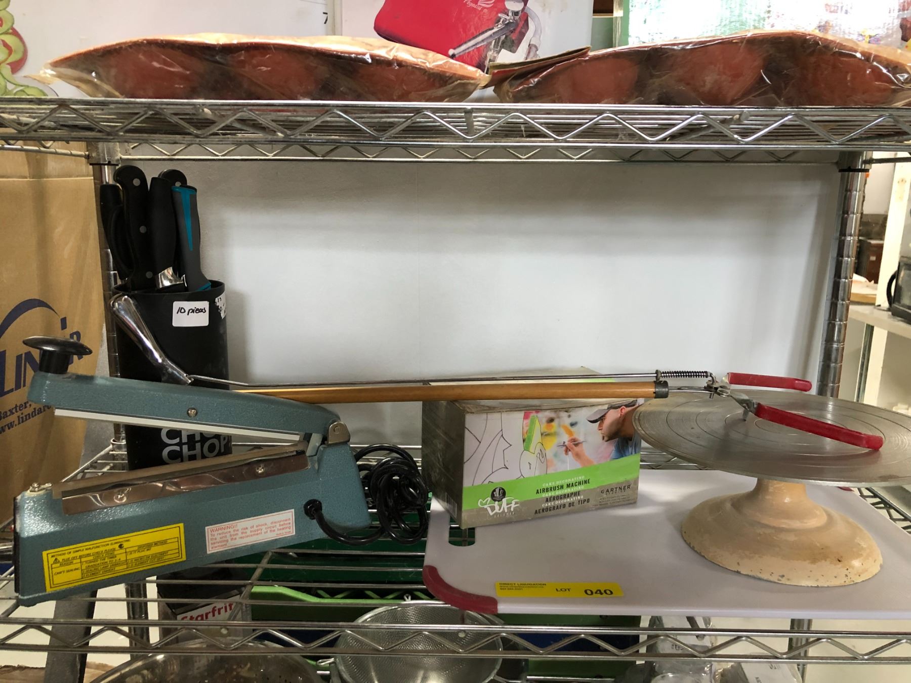 Shelf lot of 5 cooking related items - airbrush machine/cake plate/cutting board/heat sealer & knife block set w/8 knives