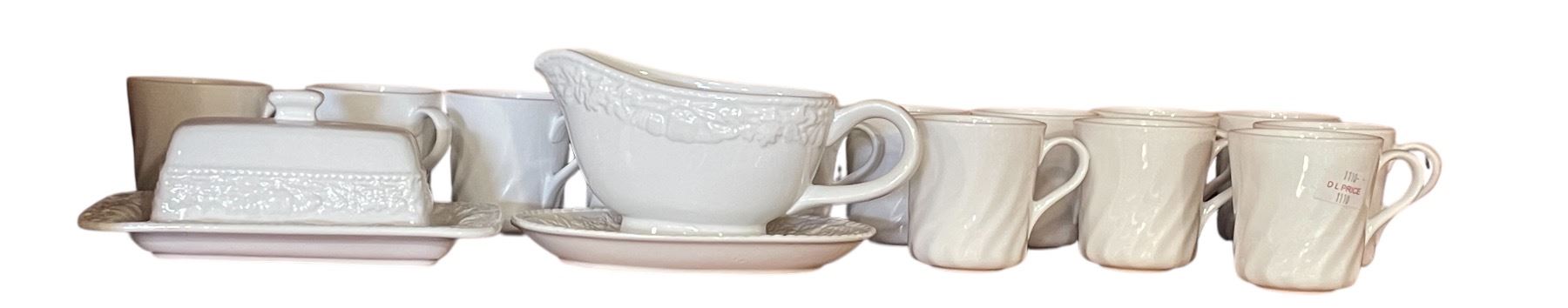 Shelf lot of Banquet Sginature Houseware - Butter Holder, Mugs, Gravy Bowl, Etc.