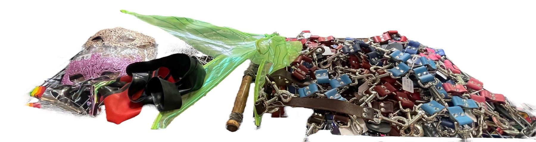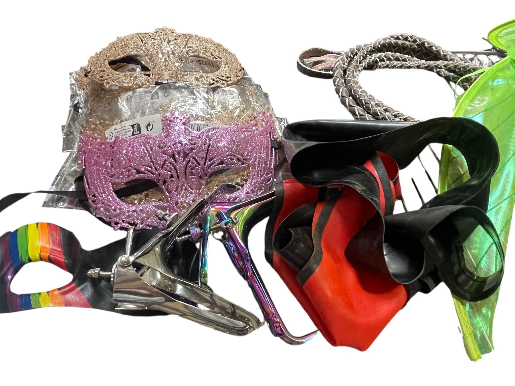 Shelf lot of Misc - Fantasy Whip, Masks, Fairy Wings, Hog Tie, Etc.