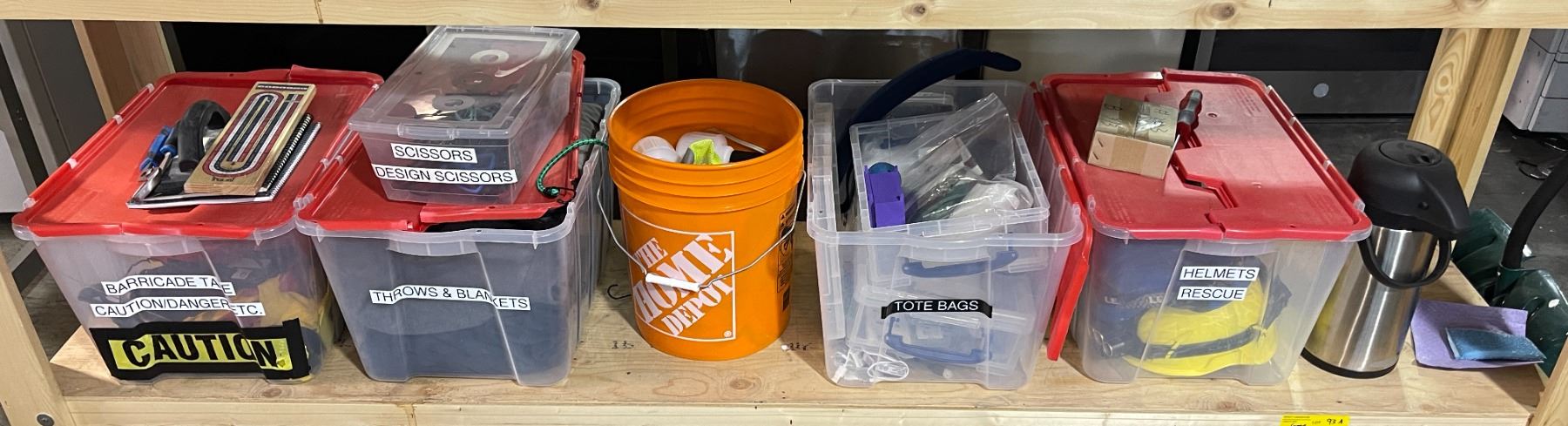 Shelf lot of Set Dec Misc - Blankets, Scissors, Caution Tape, Tote Bags, Rescue Helmets, Etc.
