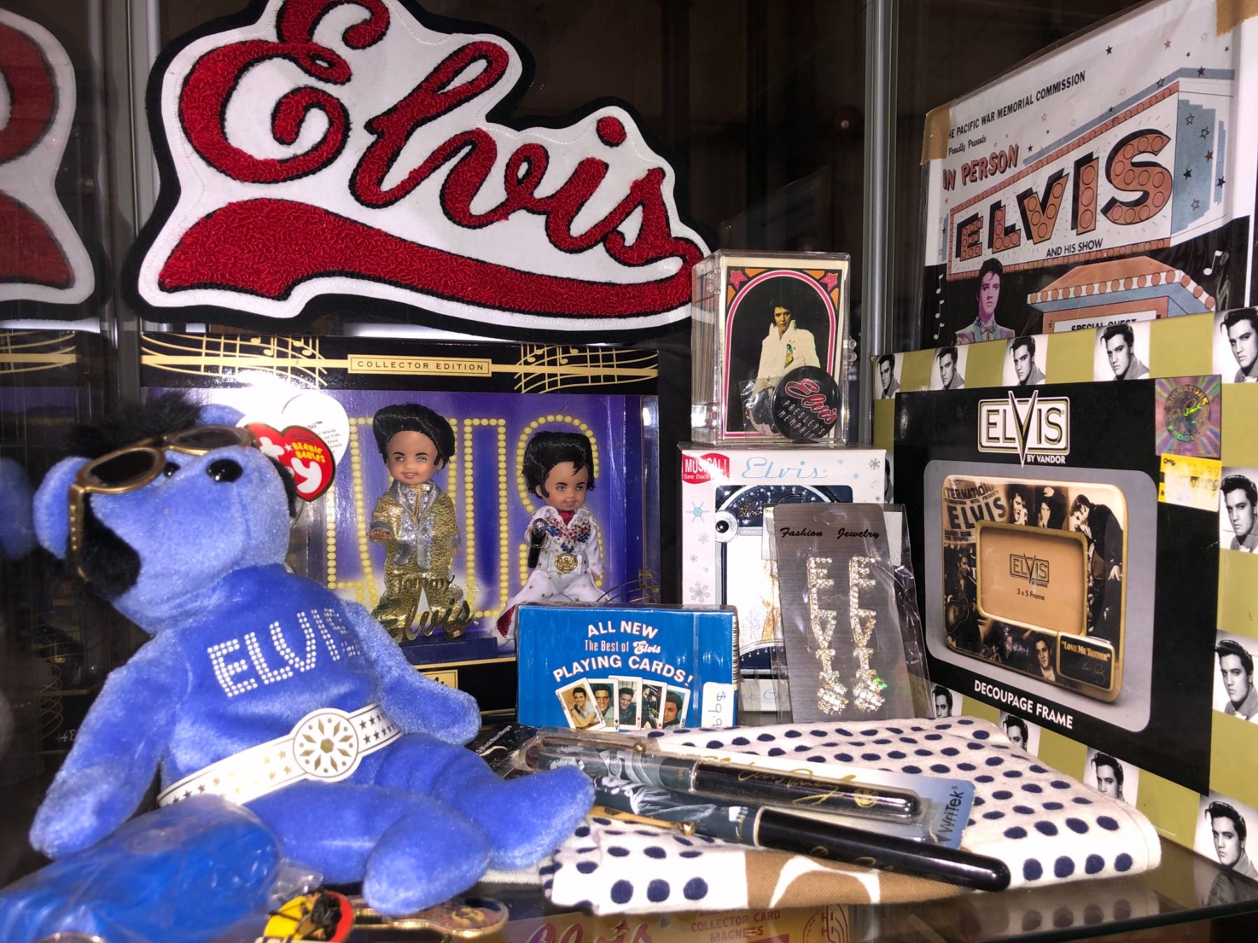 Shelf lot of assorted Elvis Presley memorabilia - sew-on patch/ TY Elvis Beanie Baby/ assorted figurines etc.