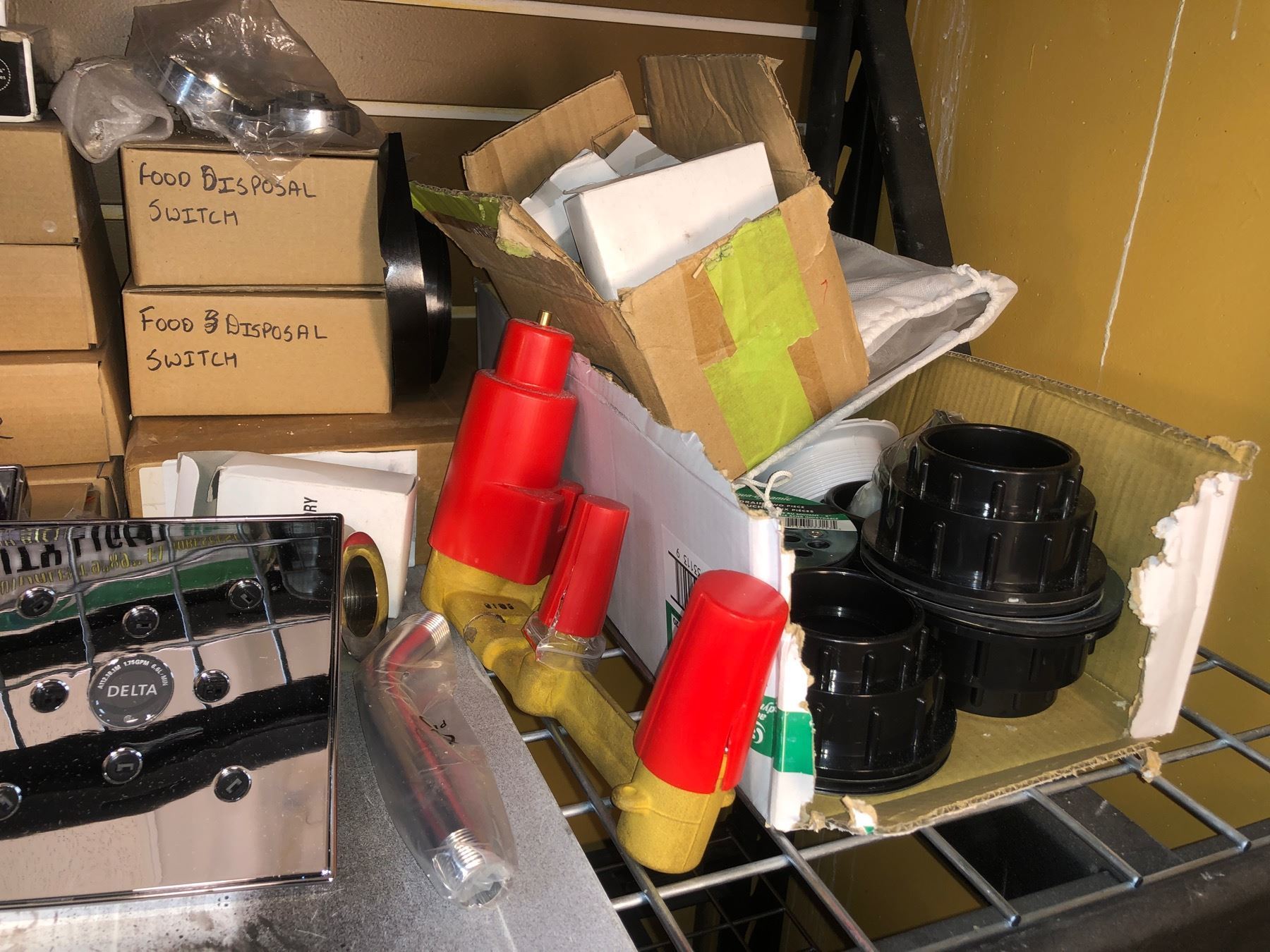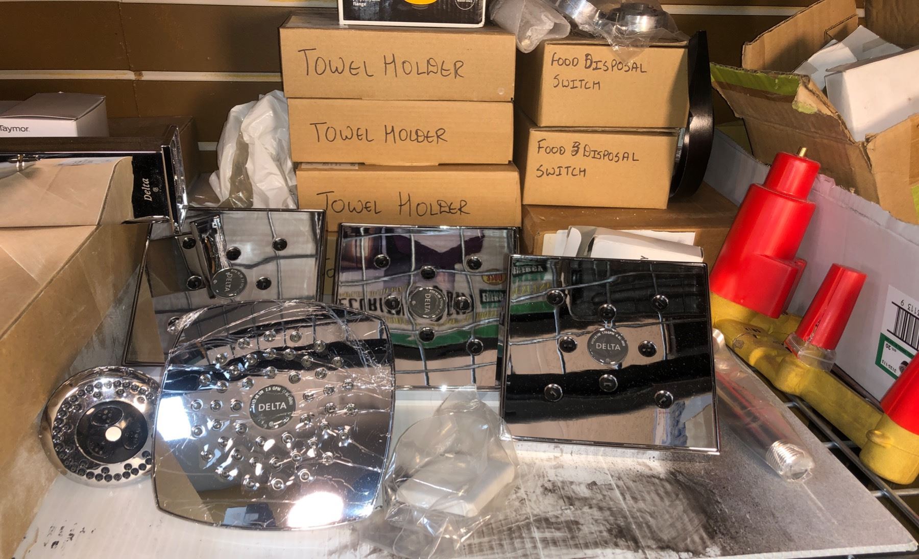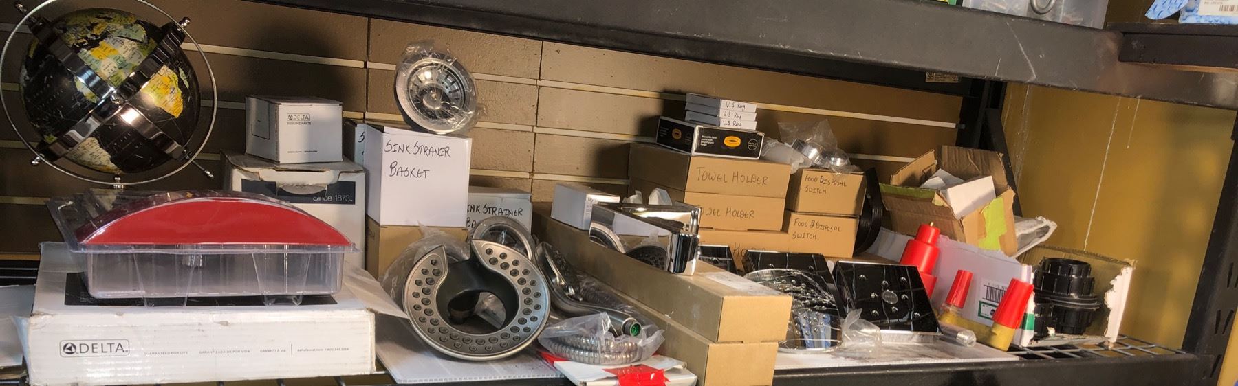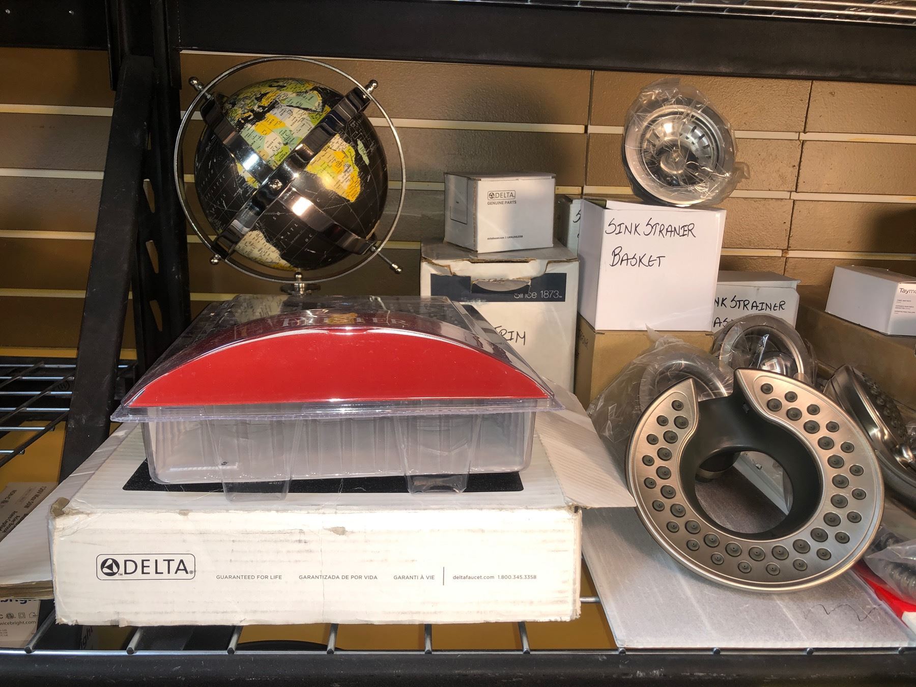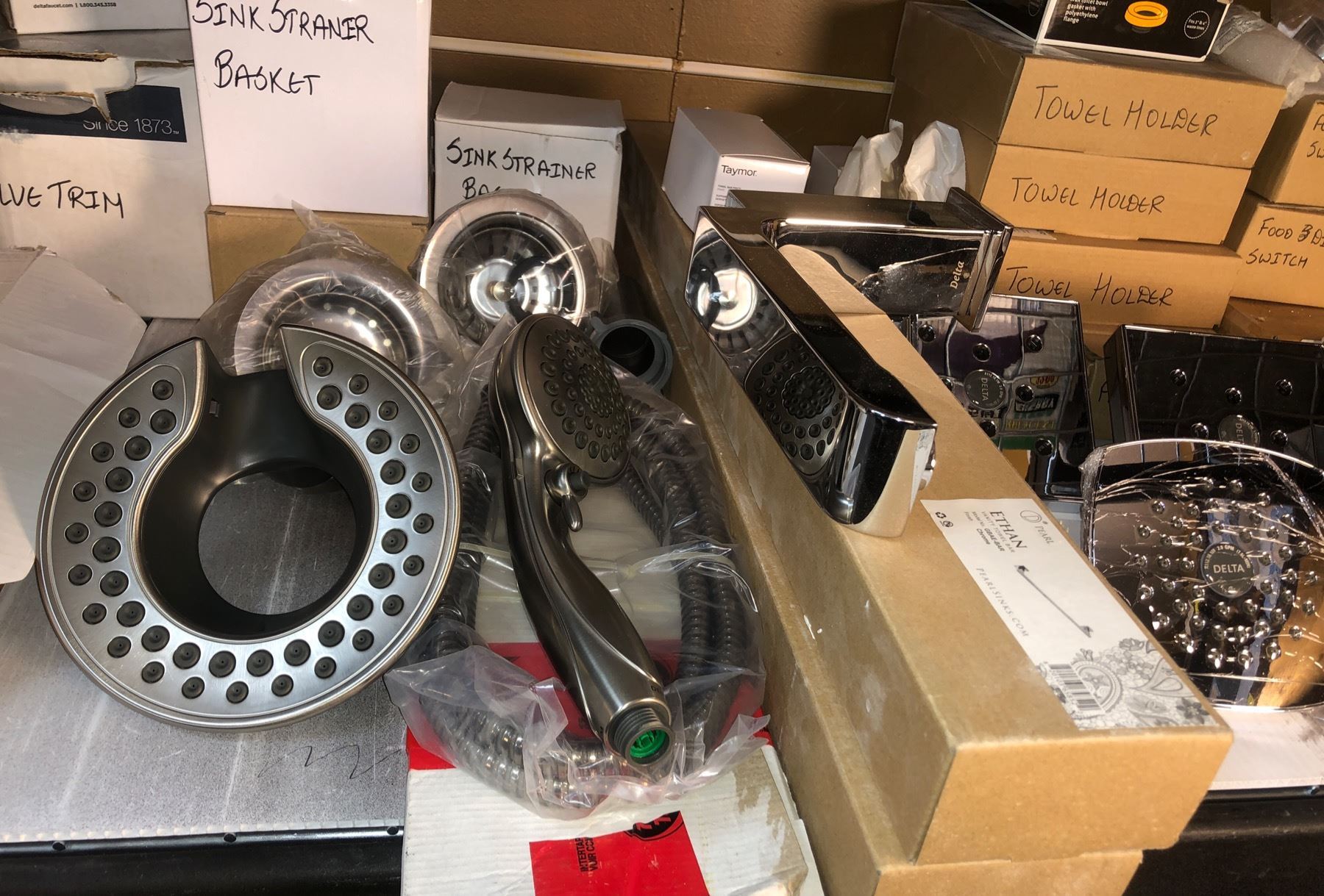 Shelf lot of assorted bathroom items includes - shower heads, sink strainer baskets, towel holders, etc...