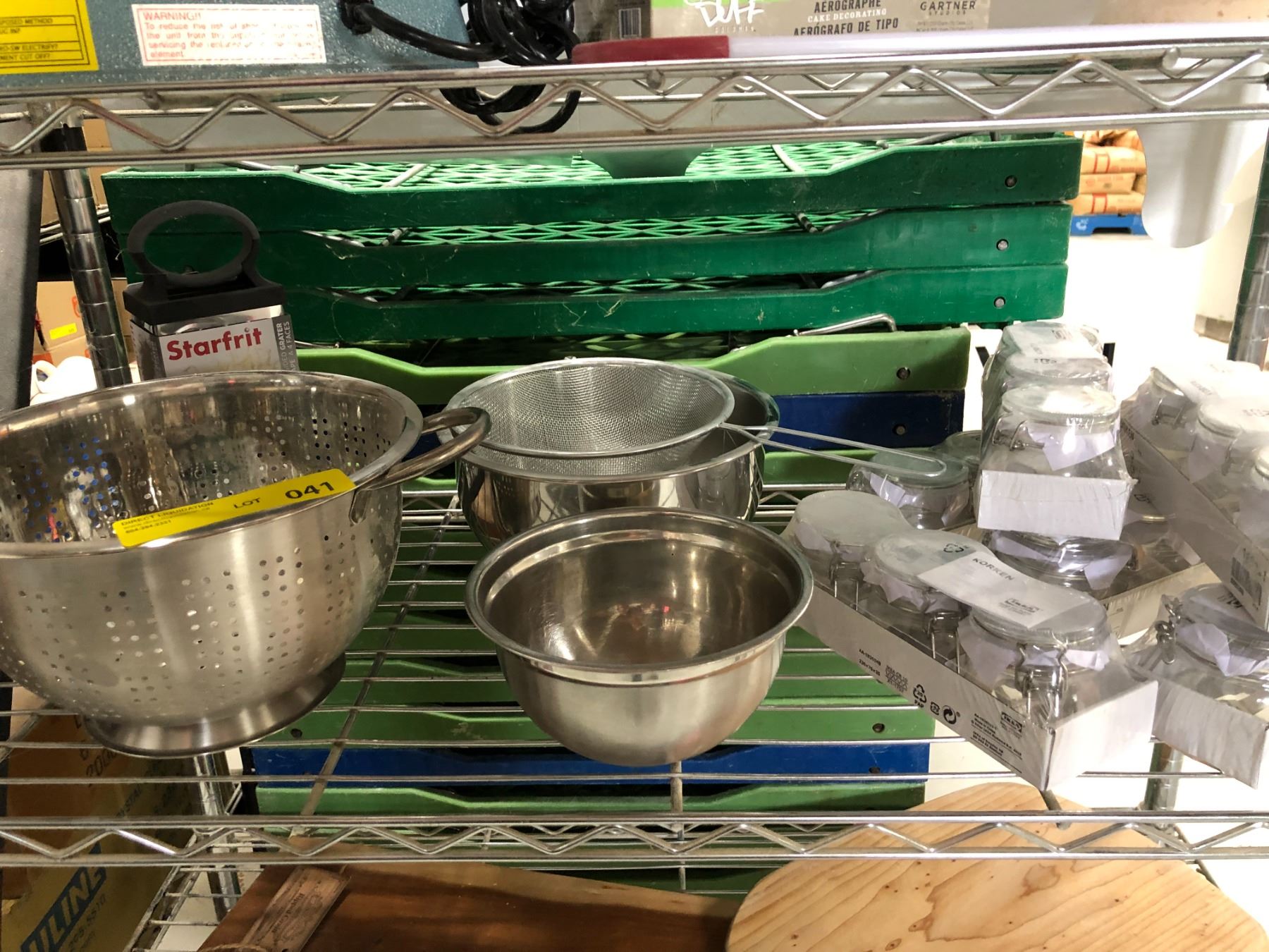 Shelf lot of assorted cooking items - strainer/ stainless mixing bowls/ cheese grater/ 6 small 3pc storage jar sets