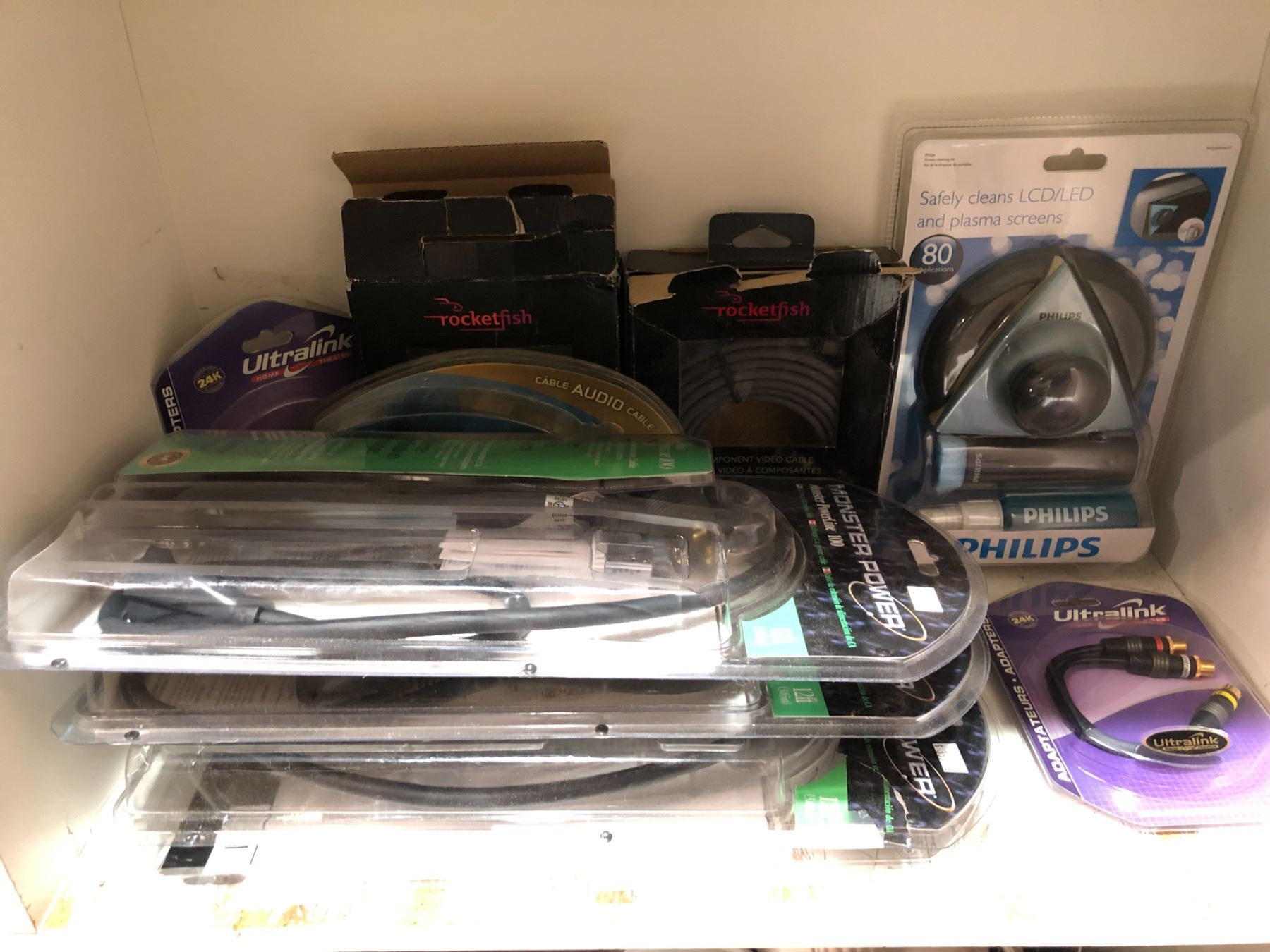 Shelf lot of assorted electronic accessories - monster power bars/ audio cables/ LCD/LED safety cleaner