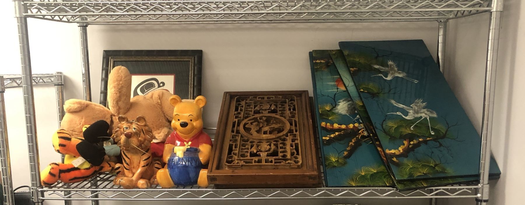 Shelf lot of assorted items - includes Chinese carved panels / Asian lacquered wall hanging / Winnie the Pooh money box statue etc