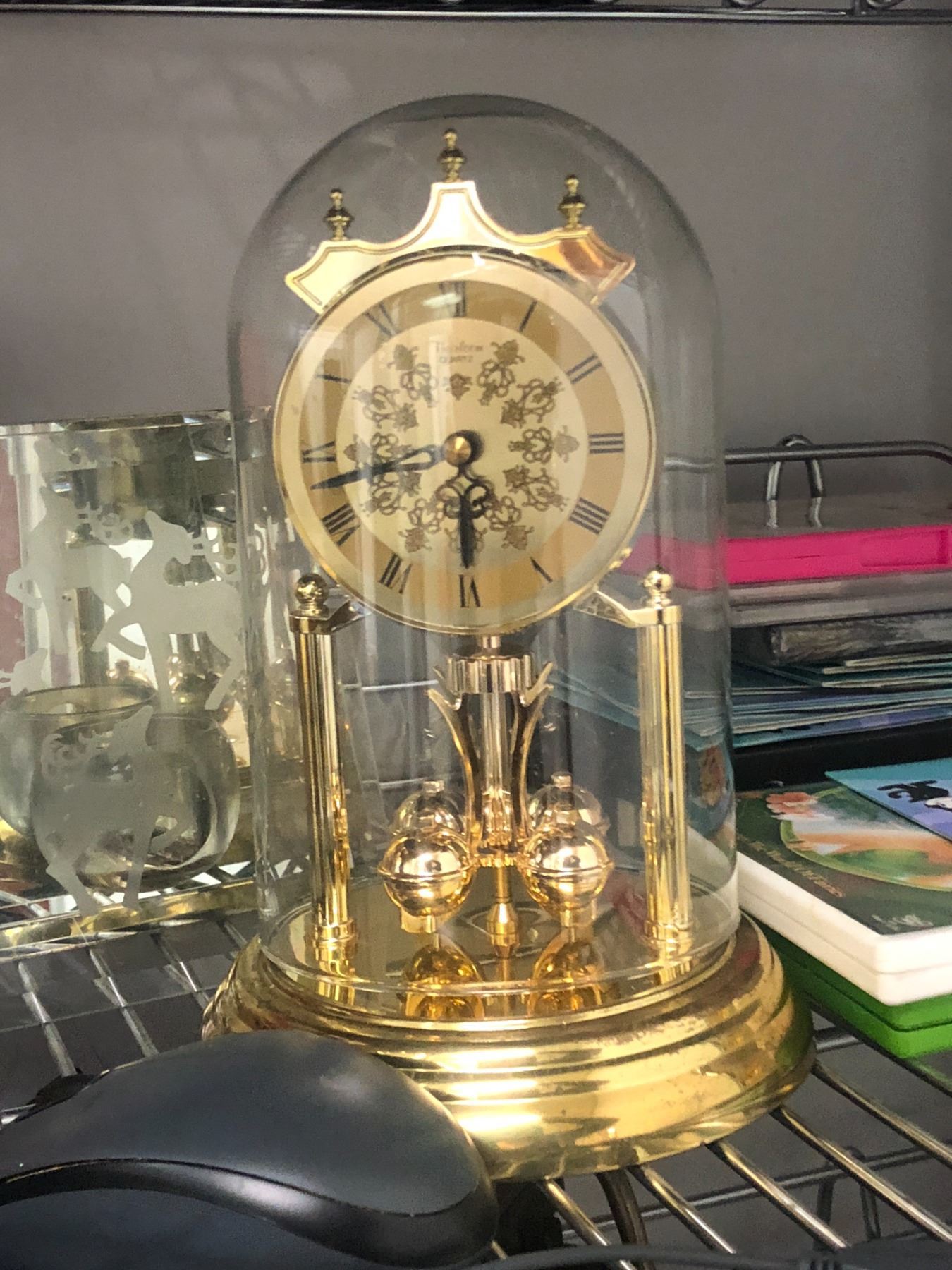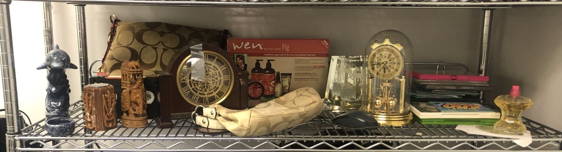 Shelf lot of assorted items - includes mantel clock / Heirloom quartz wall clock / DVDs etc