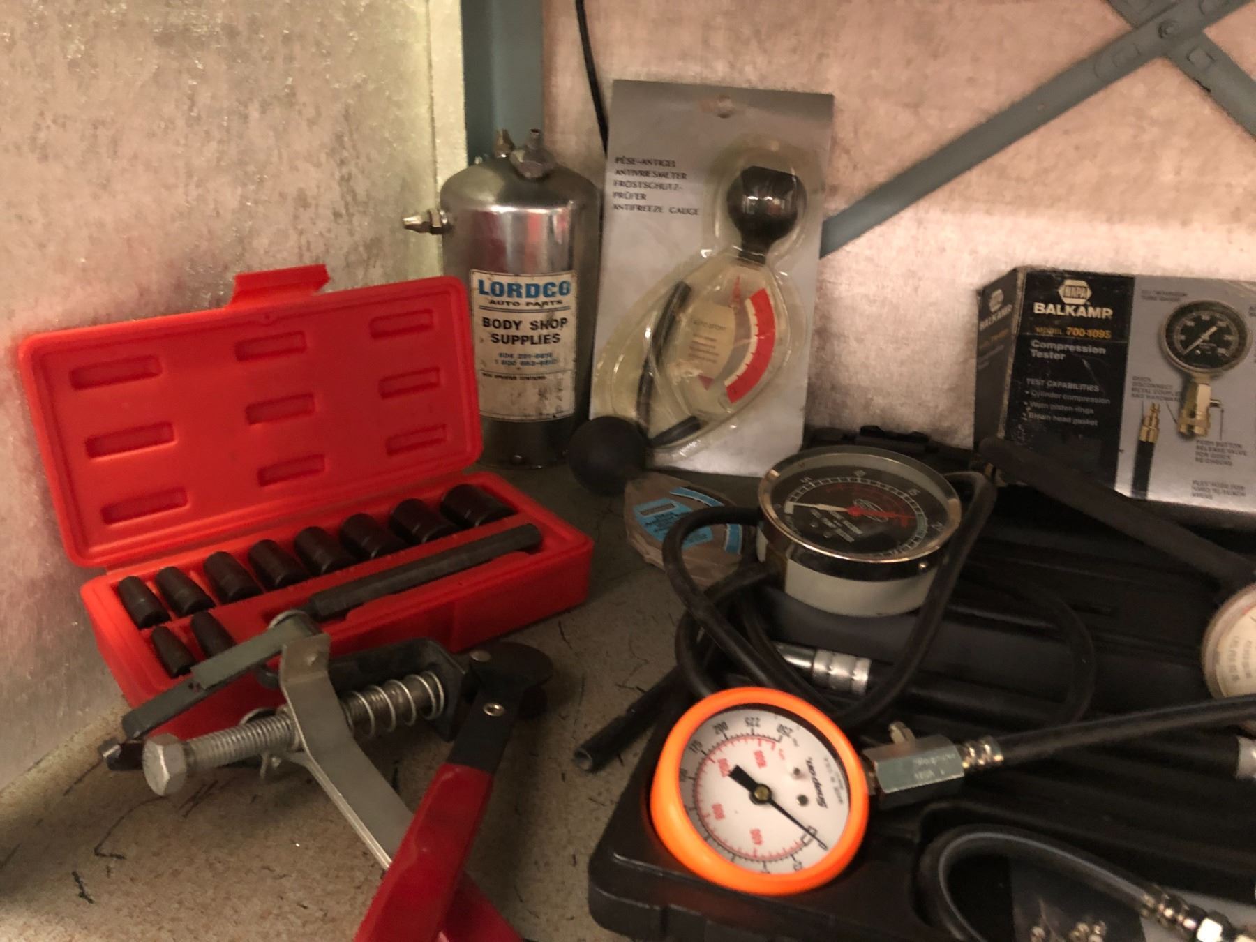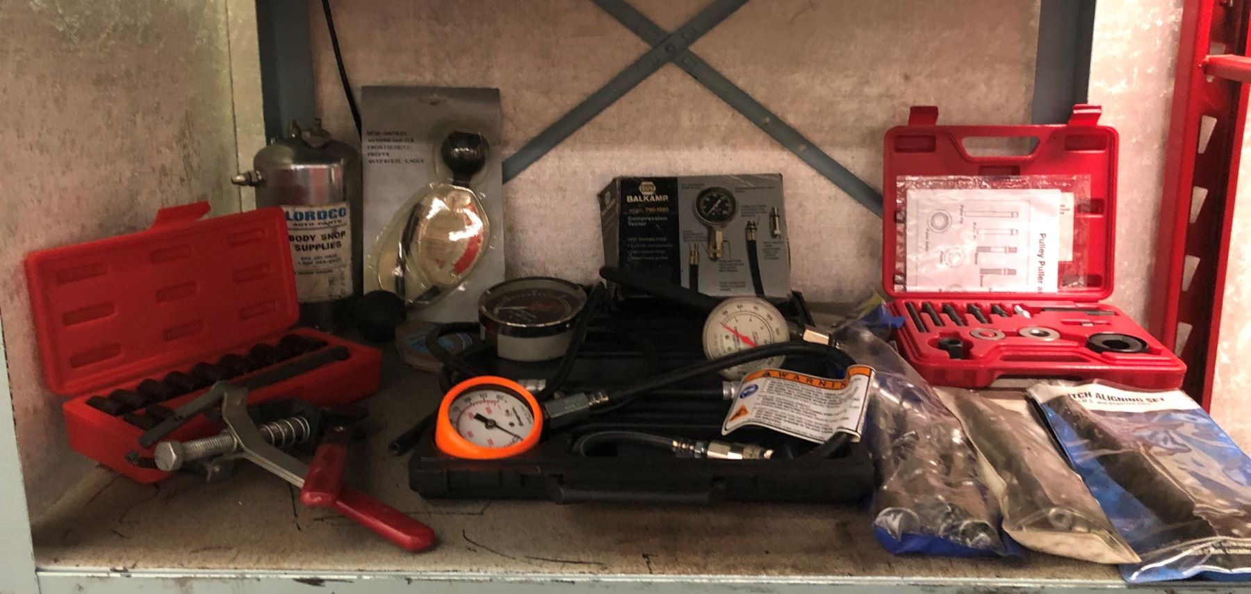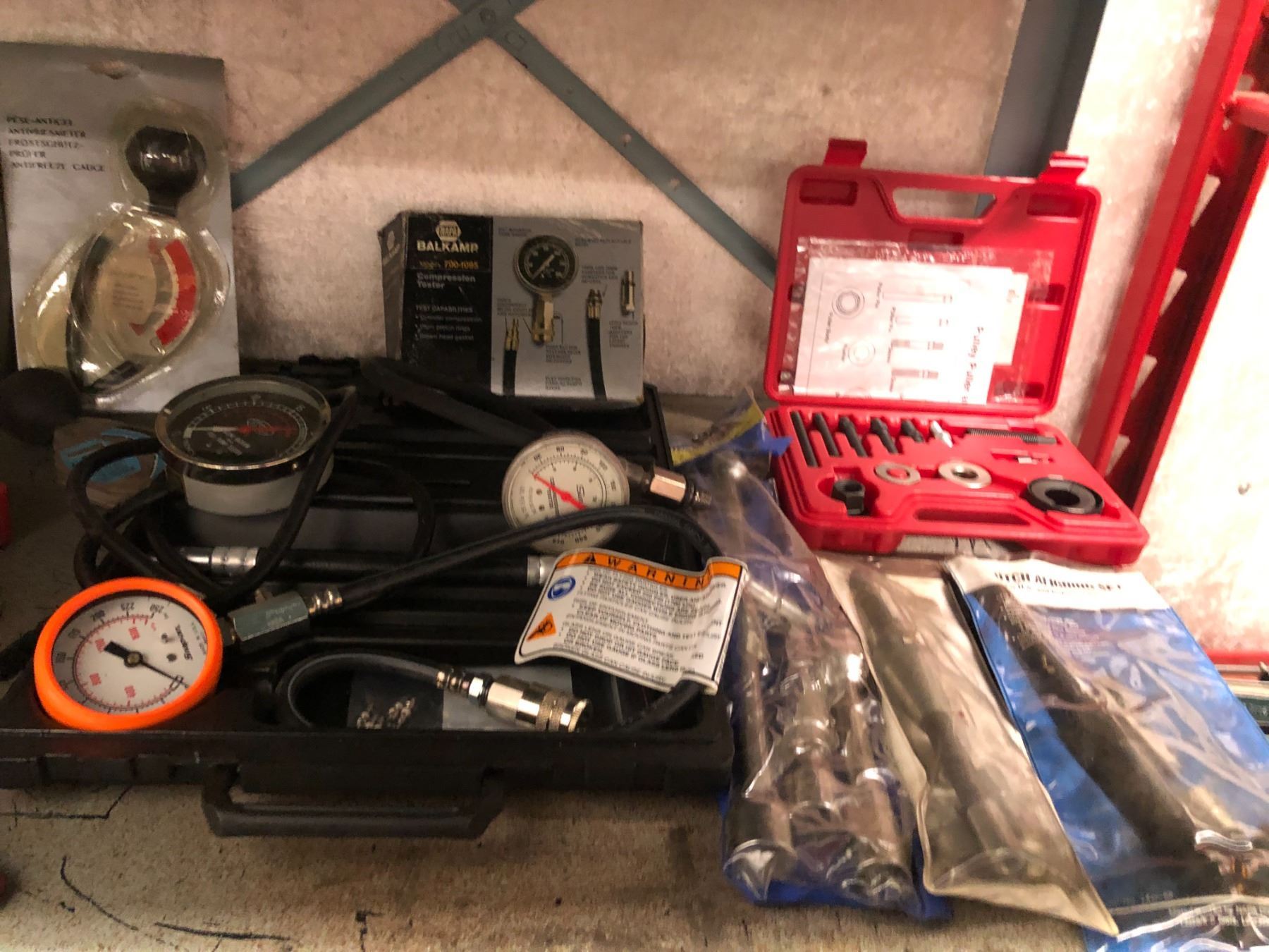 Shelf lot of assorted mechanics tools, gauges/ pulleys - Snap-on/ Son/ Napa etc.