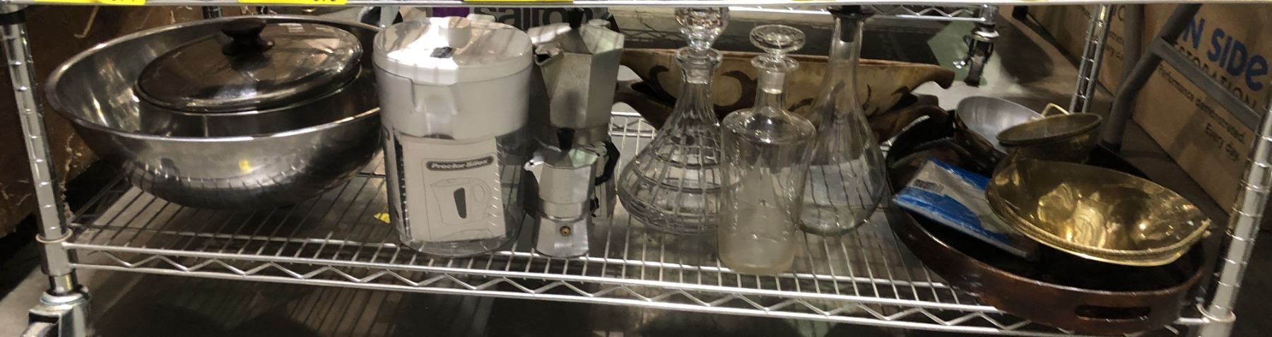 Shelf lot of assorted misc items - includes Salton stainless steel kettle / glass decanters / Italian aluminum espresso pots etc