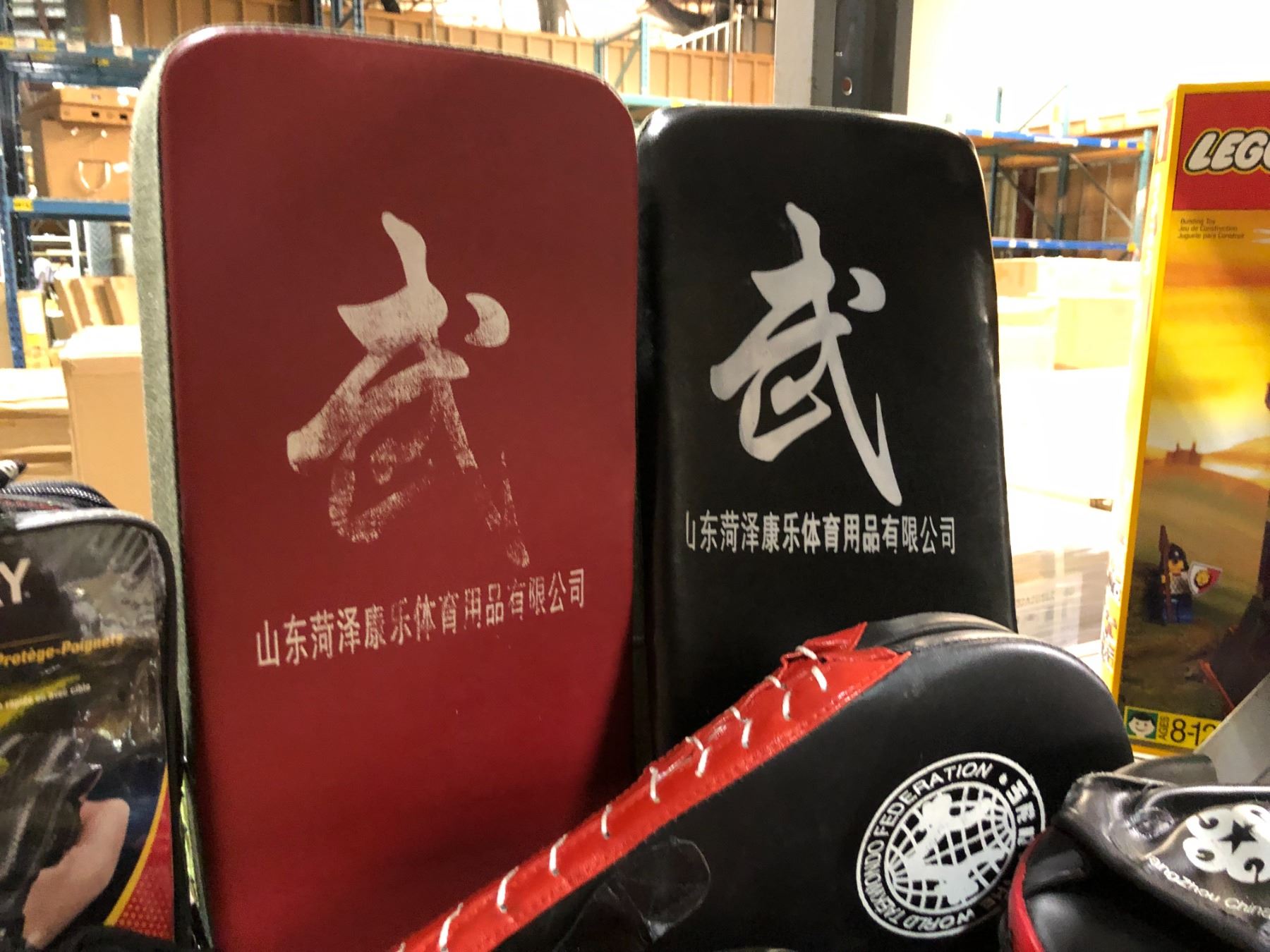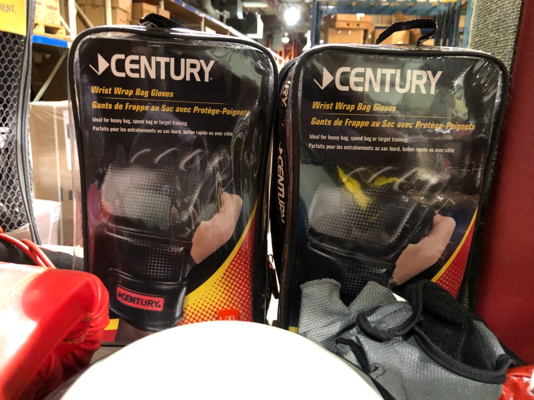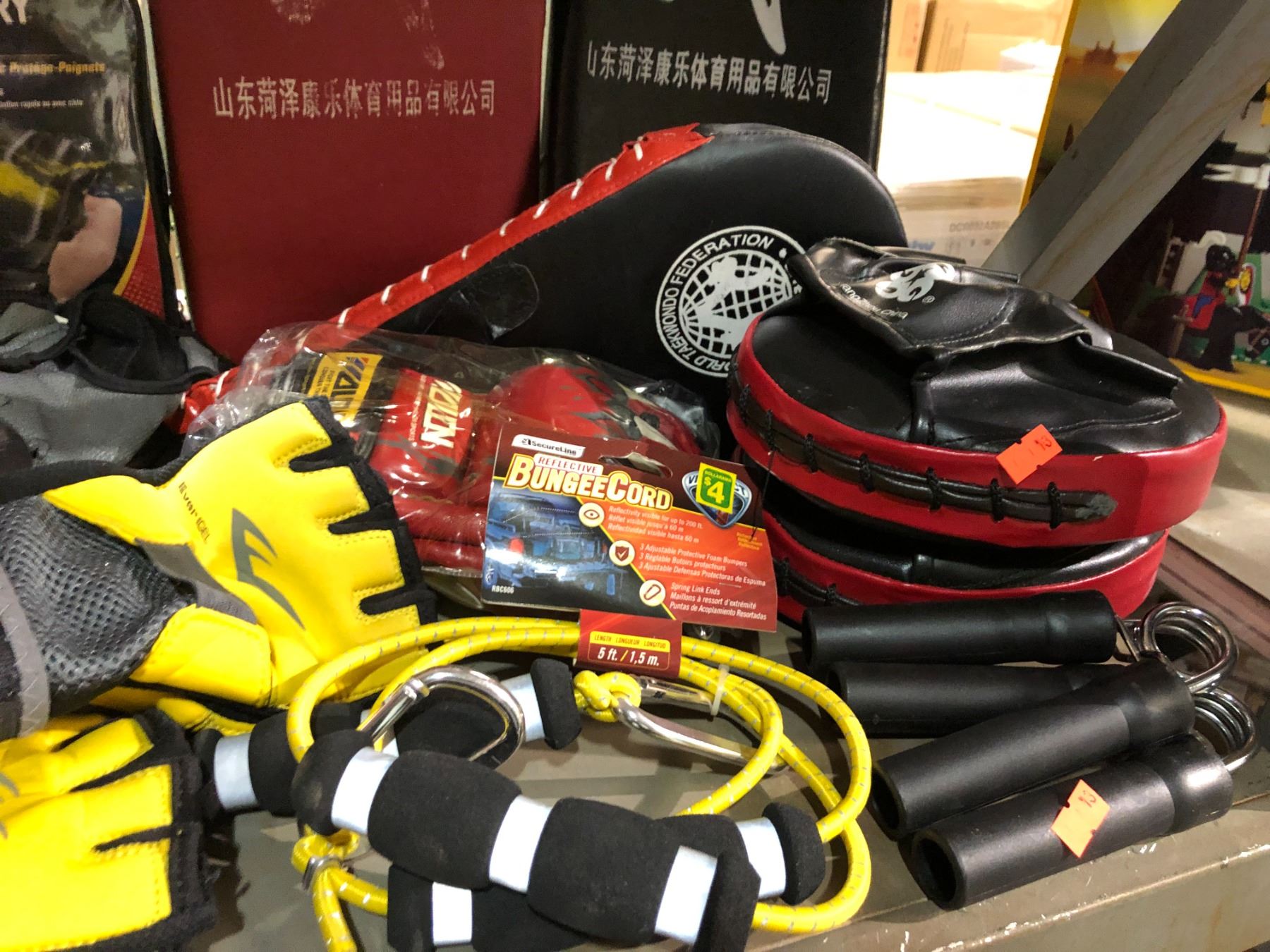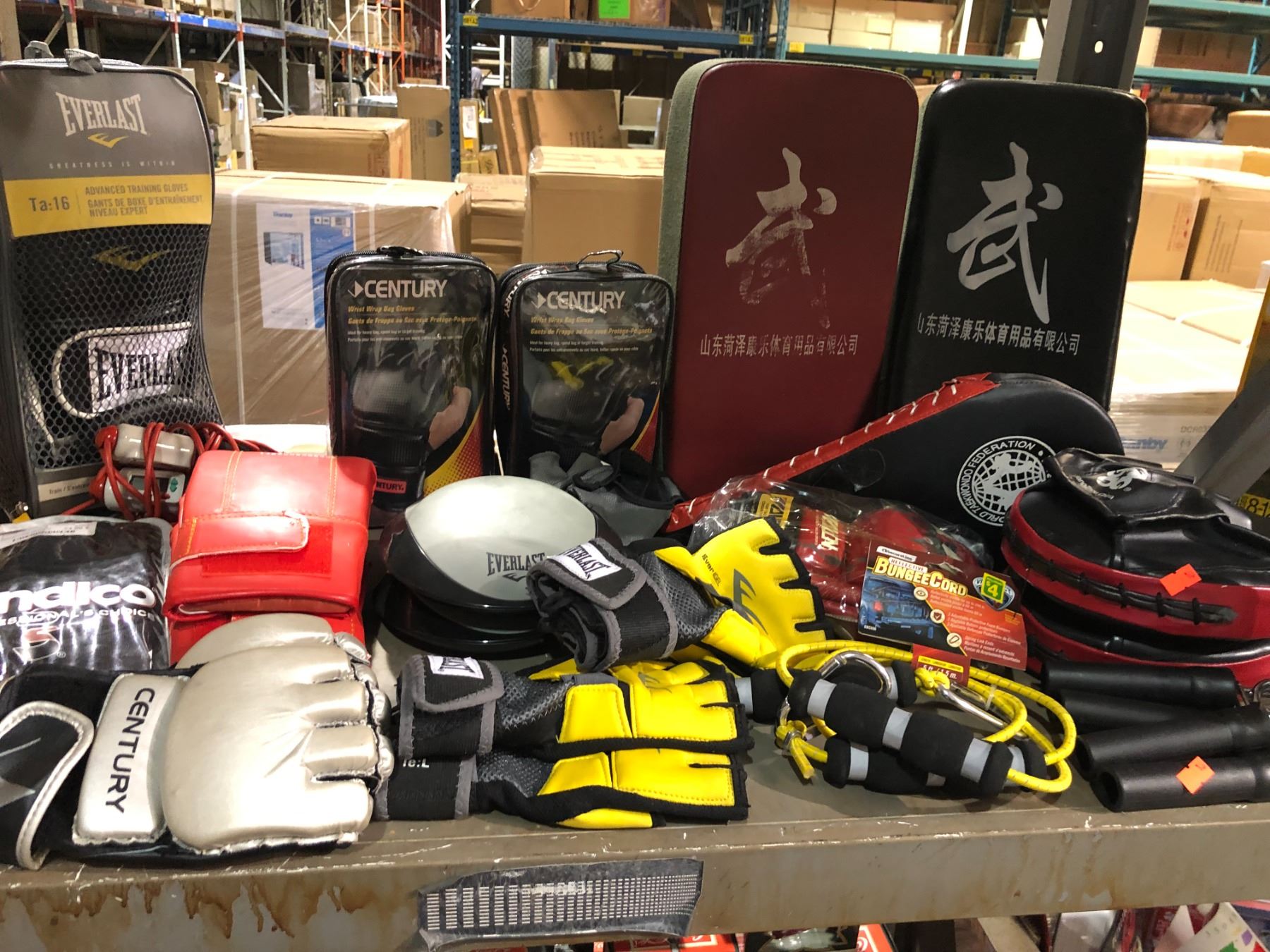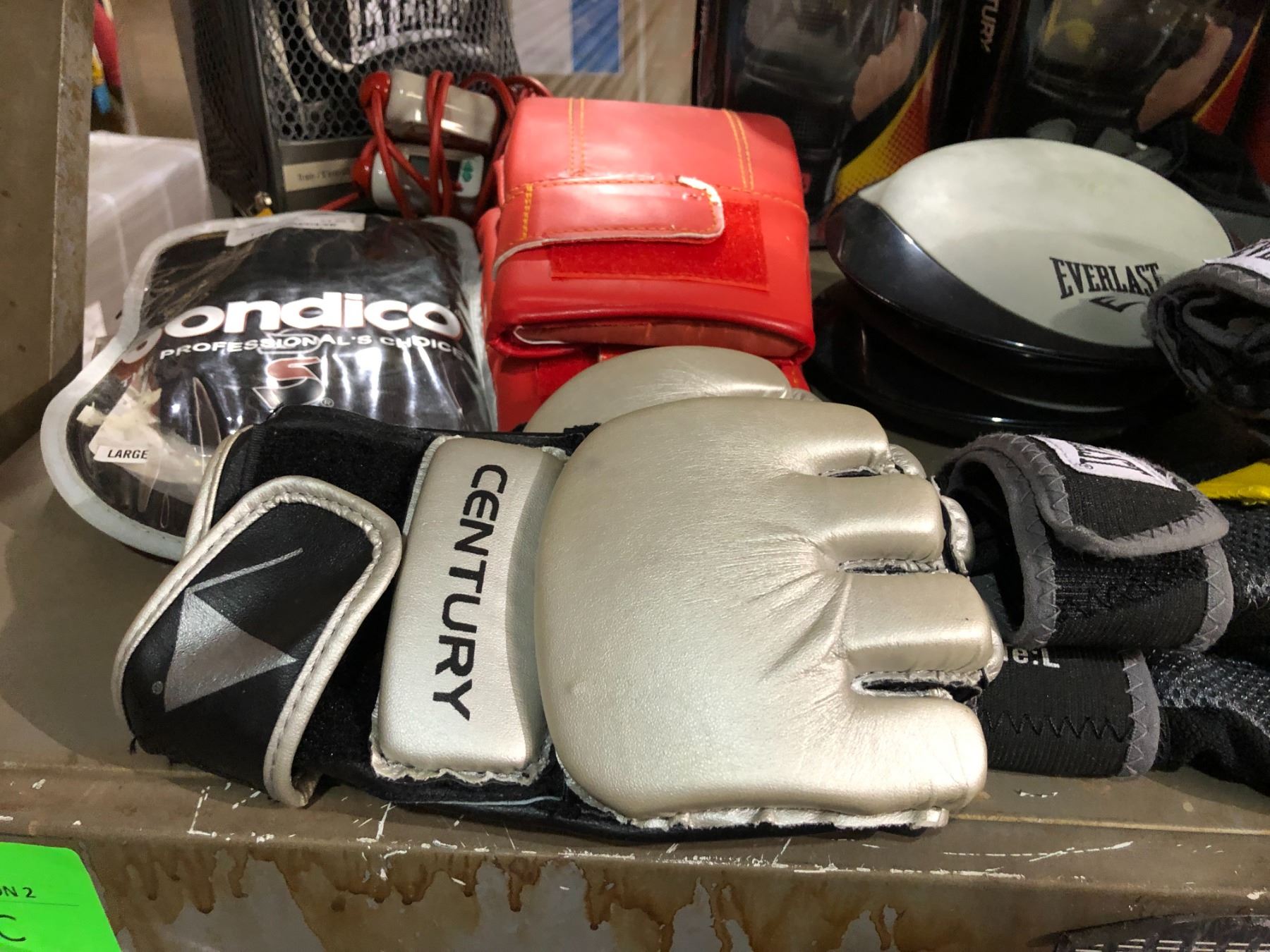 Shelf lot of assorted mixed martial arts fighting gear/training gear