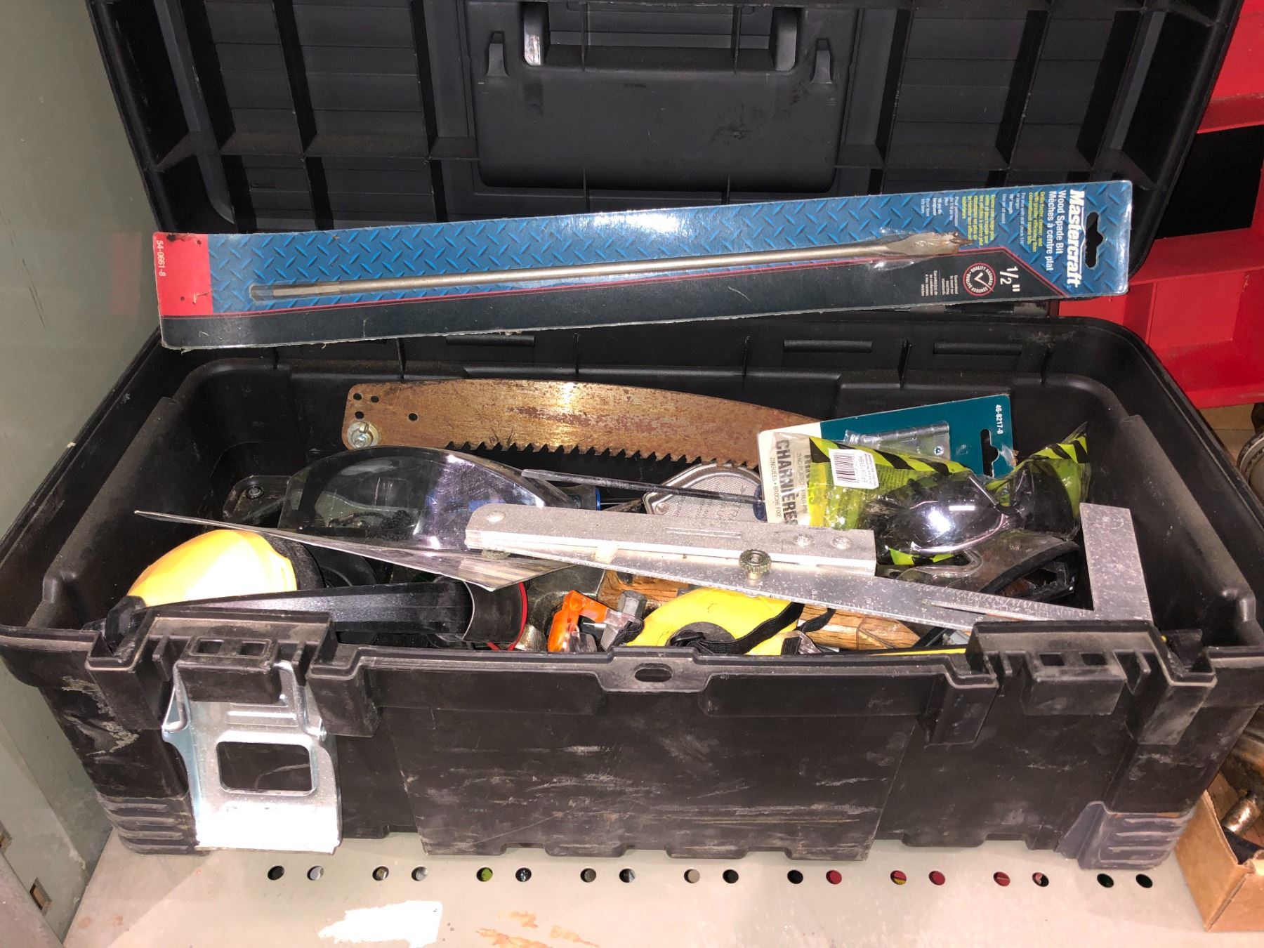 Shelf lot of assorted tools - tools box & contents/assorted grease guns/parts organizer/tray