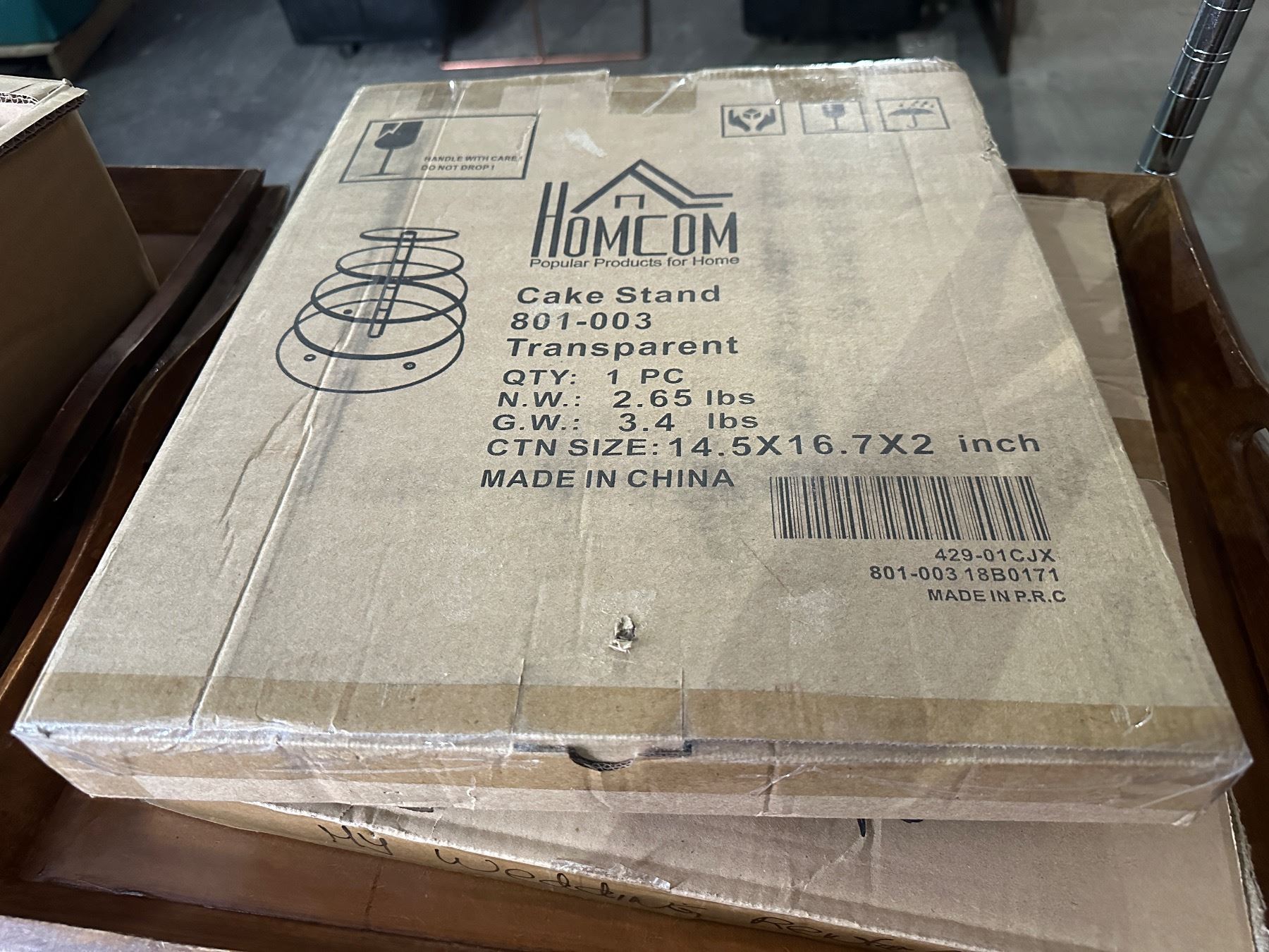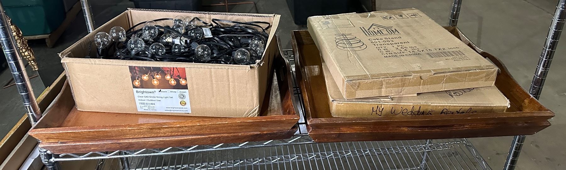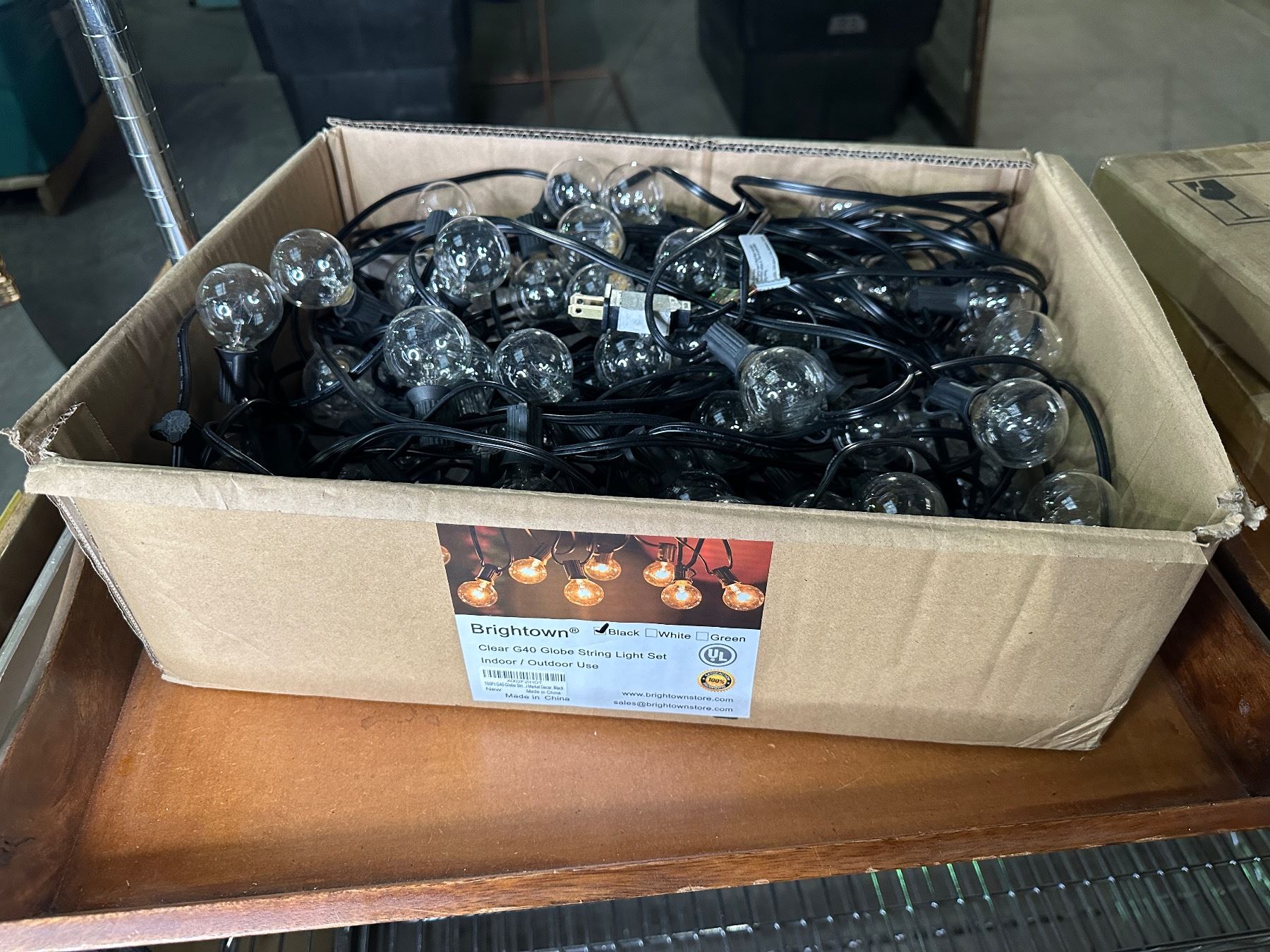 Shelf lot of cake stands, platters, G40 globe string light set, etc....