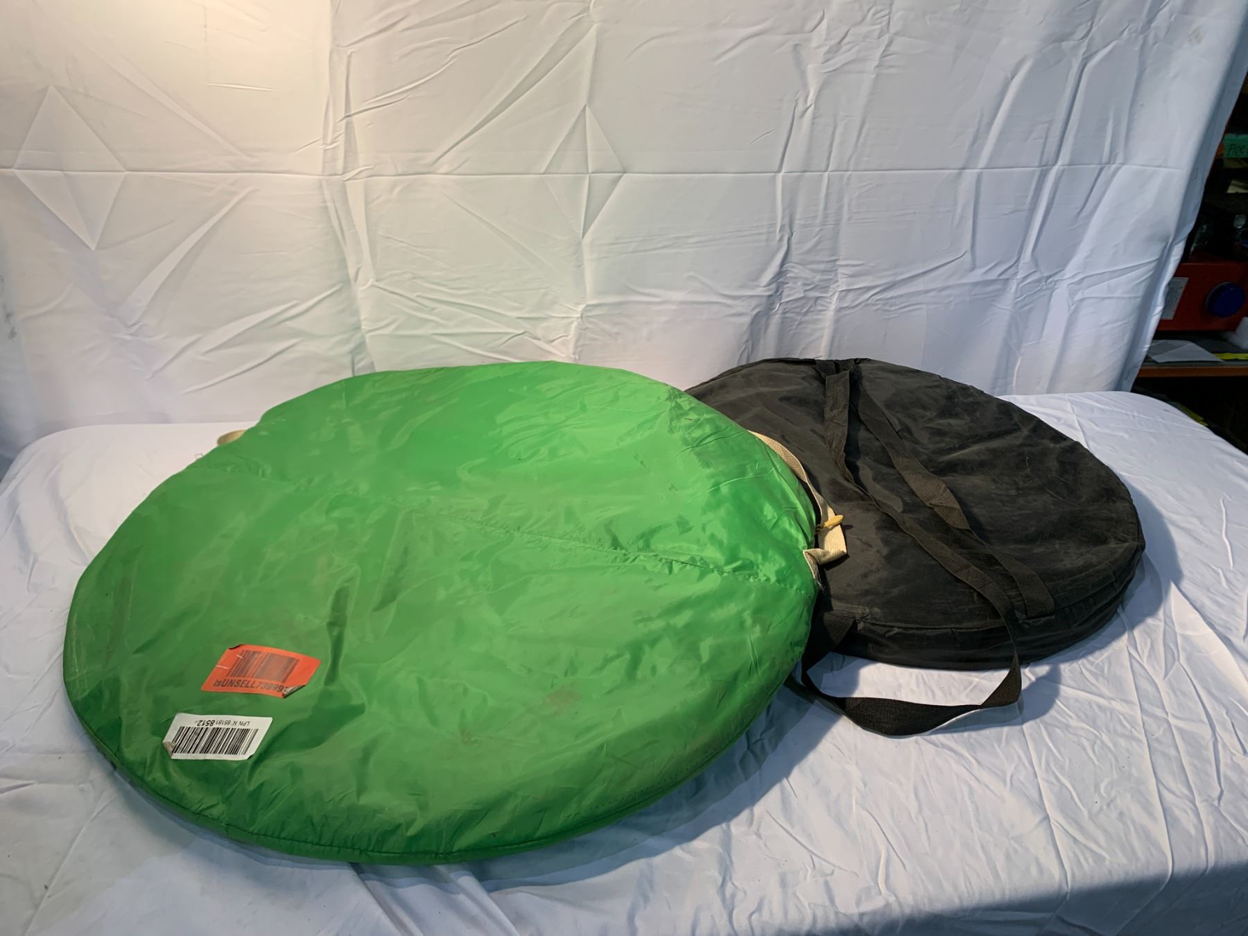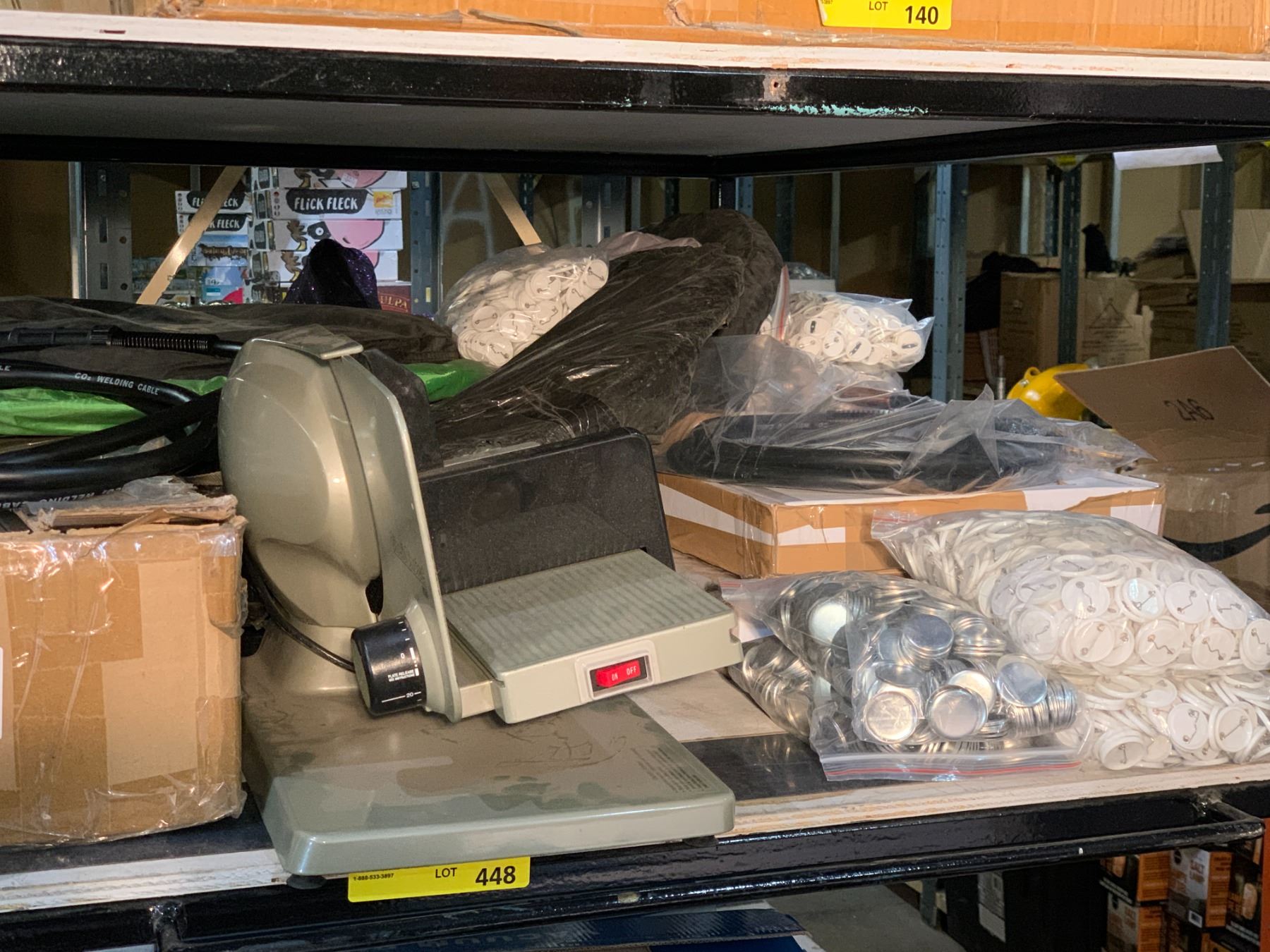 Shelf lot of misc. - includes pool waterfall LED light/Chef's Choice cutting machine/camping tents/Button Maker Badge Machine w/button parts etc.