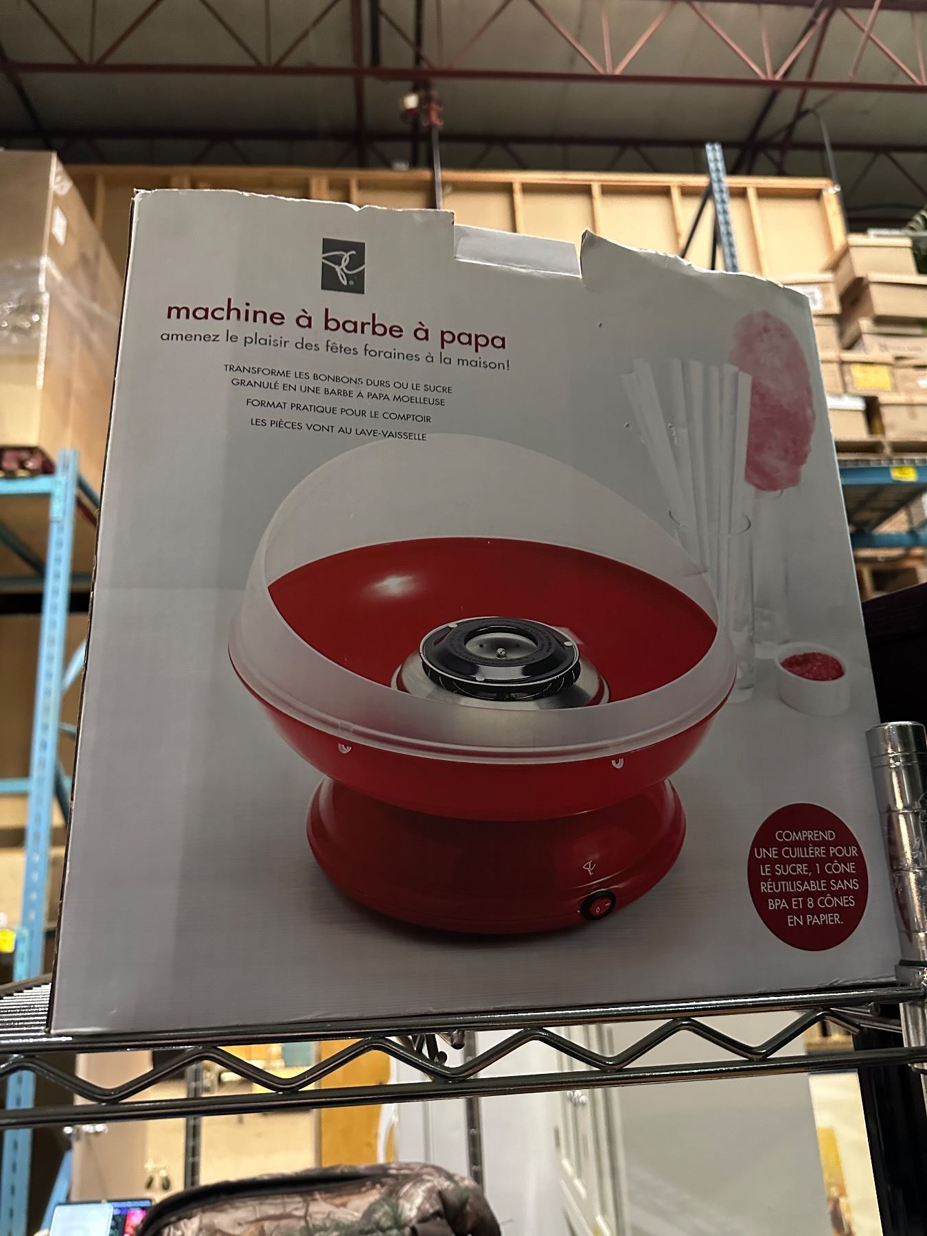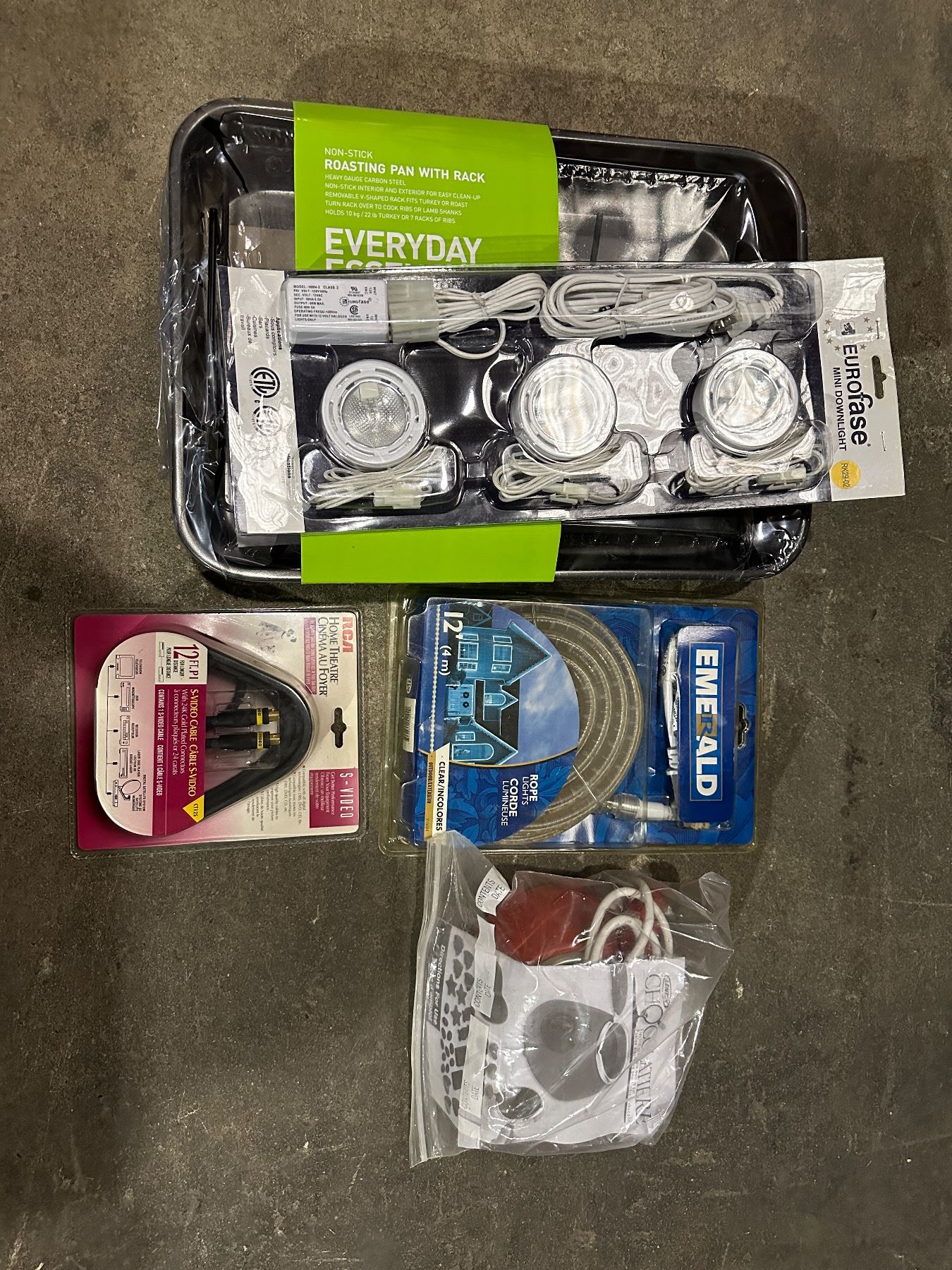 Shelf lot of misc items including - cotton candy maker, tray food dehydrator, rope lights, home theatre cable, roasting pan w/rack, etc...